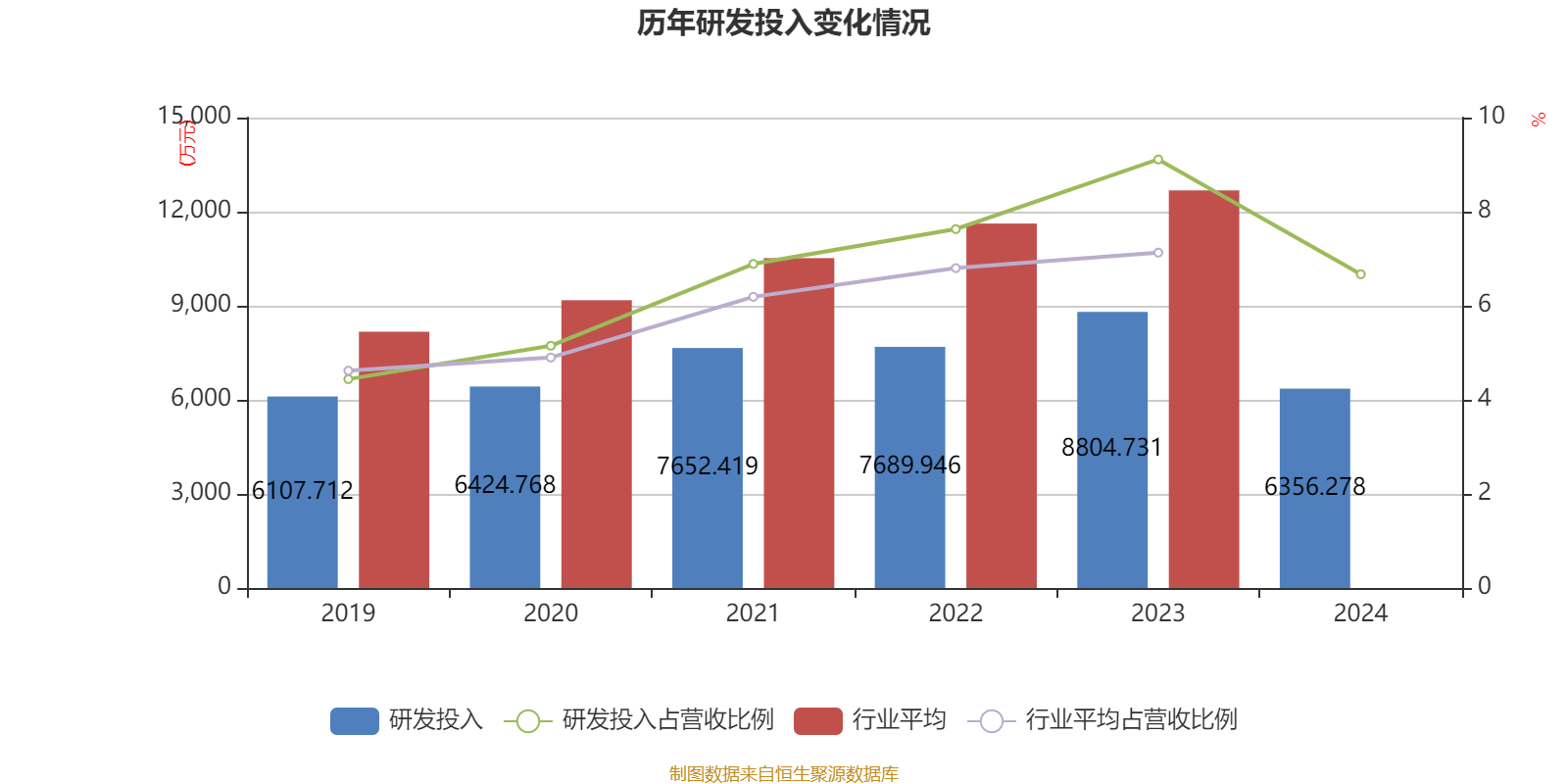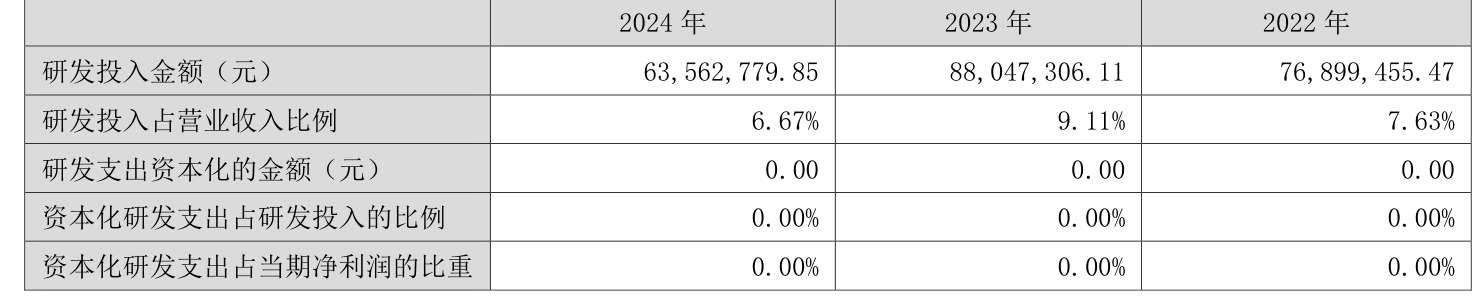 2024年全年,公司研发投入金额为6356.28万元,同比下降27.81%;研发投入占营业收入比例为6.67%,相比上年同期下降2.44个百分点。此外,公司全年研发投入资本化率为0%。