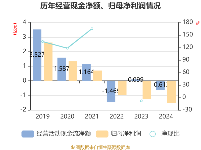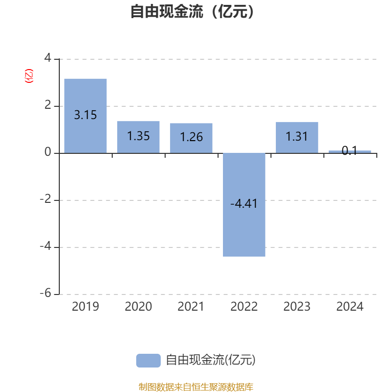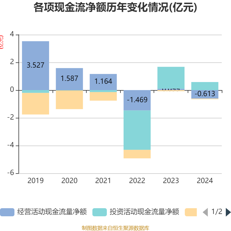 截至2024年,公司经营活动现金流净额为-6134.44万元,同比减少7123.85万元;筹资活动现金流净额-446.39万元,同比增加362.75万元;投资活动现金流净额5812.55万元,上年同期为1.58亿元。