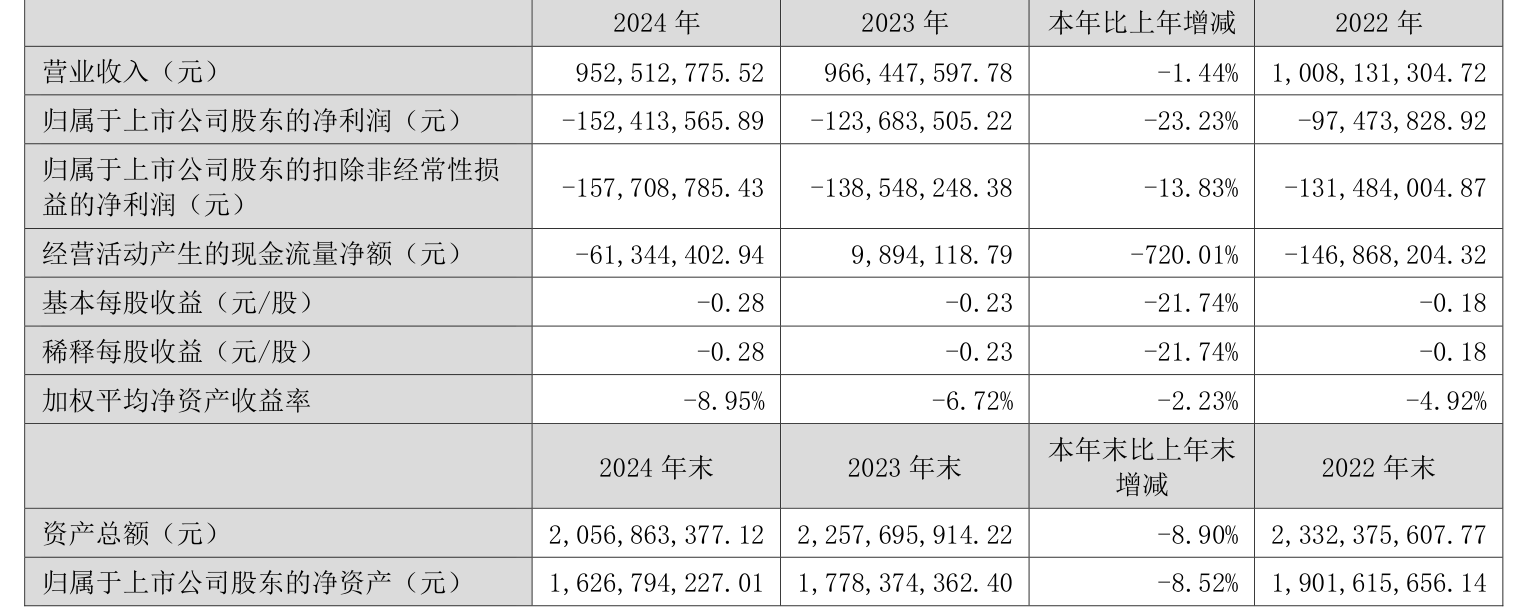 中证智能财讯ST先河(维权)(300137)4月24日披露2024年年度报告。2024年,公司实现营业总收入9.53亿元,同比下降1.44%;归母净利润亏损1.52亿元,上年同期亏损1.24亿元;扣非净利润亏损1.58亿元,上年同期亏损1.39亿元;经营活动产生的现金流量净额为-6134.44万元,上年同期为989.41万元;报告期内,ST先河基本每股收益为-0.28元,加权平均净资产收益率为-8.95%。