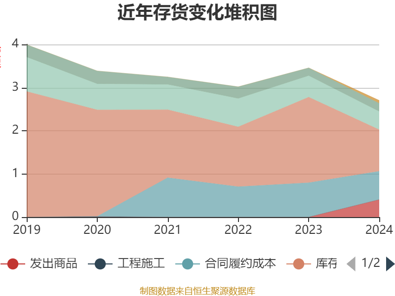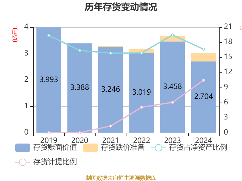 从存货变动来看,截至2024年末,公司存货账面价值为2.7亿元,占净资产的16.62%,较上年末减少7534.53万元。其中,存货跌价准备为3151.93万元,计提比例为10.44%。