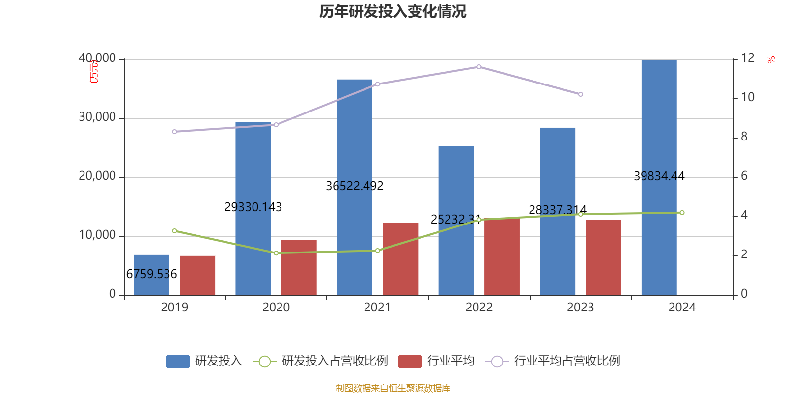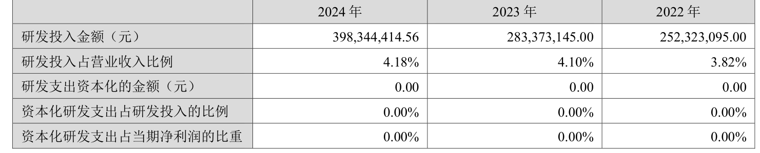 2024年全年,公司研发投入金额为3.98亿元,同比增长40.57%;研发投入占营业收入比例为4.18%,相比上年同期上升0.08个百分点。此外,公司全年研发投入资本化率为0%。