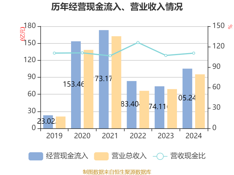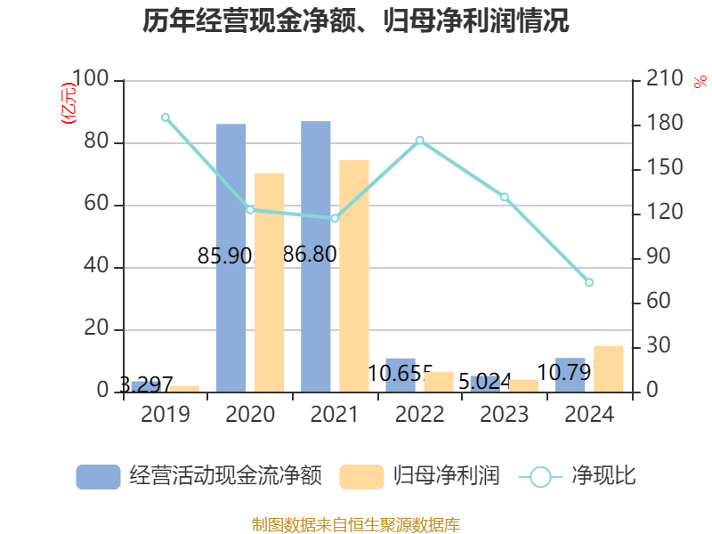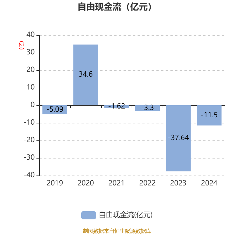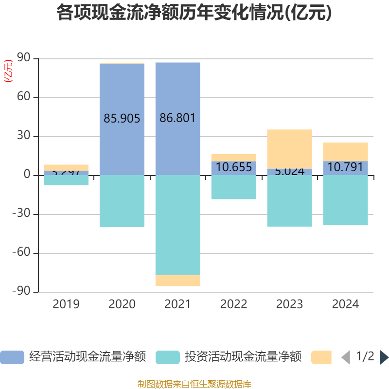 截至2024年,公司经营活动现金流净额为10.79亿元,同比增长114.78%;筹资活动现金流净额14.25亿元,同比减少15.85亿元;投资活动现金流净额-38.68亿元,上年同期为-39.76亿元。