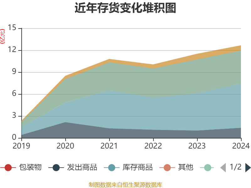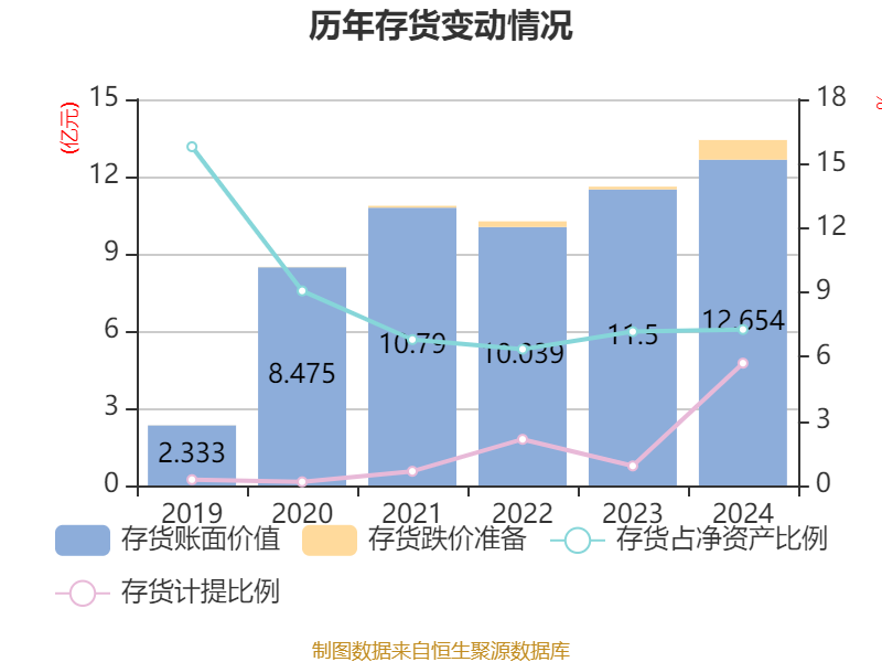 从存货变动来看,截至2024年末,公司存货账面价值为12.65亿元,占净资产的7.27%,较上年末增加1.15亿元。其中,存货跌价准备为7642.97万元,计提比例为5.7%。