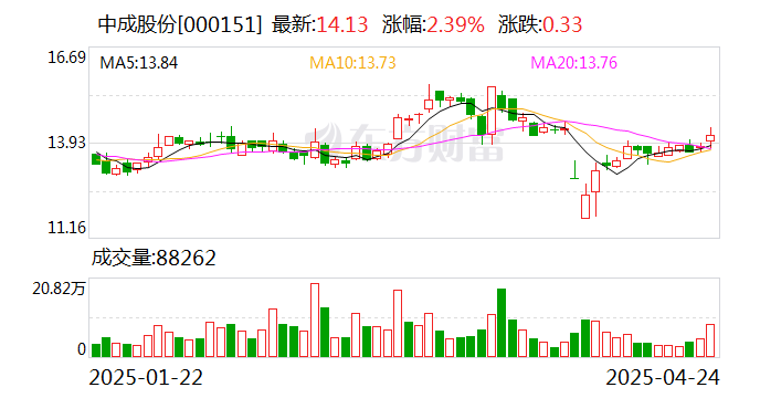 4月23日,中成股份(000151)公布2024年年报,公司营业收入为12.3亿元,同比下降60.0%;归母净利润自去年同期亏损2.63亿元变为亏损3.06亿元,亏损额进一步扩大;扣非归母净利润自去年同期亏损3.17亿元变为亏损3.02亿元,亏损额有所减少;经营现金流净额为-1543万元,同比下降102.6%;EPS(全面摊薄)为-0.9057元。