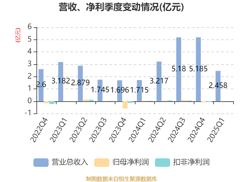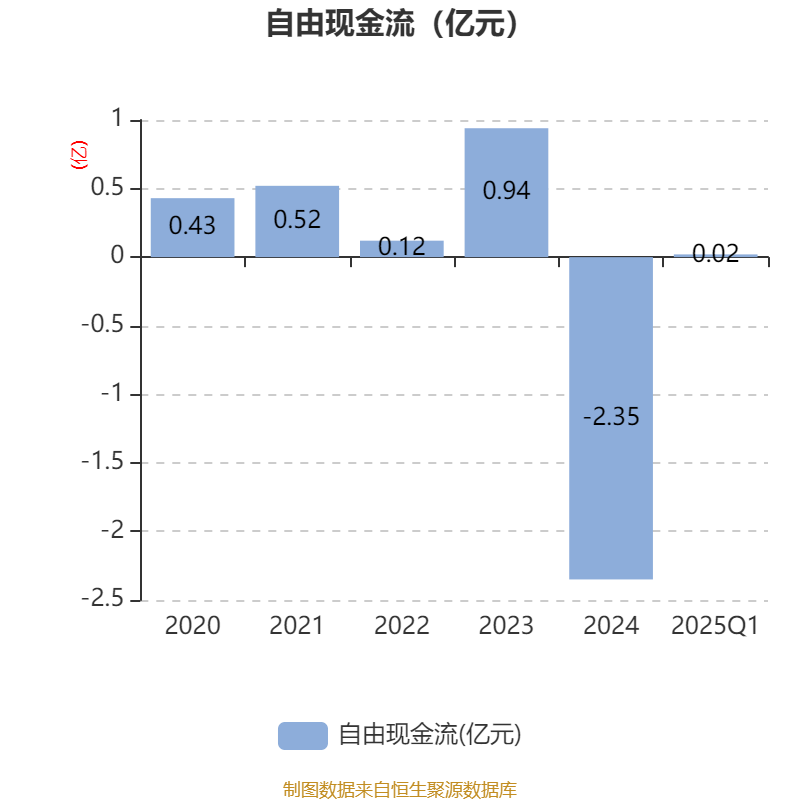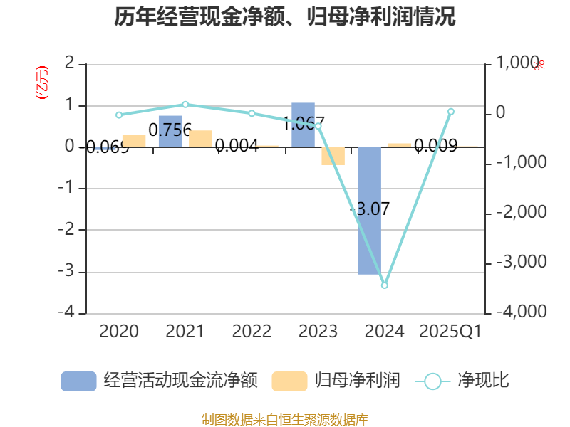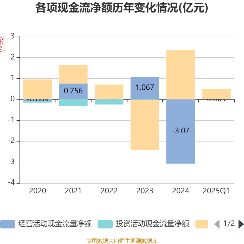 截至2025年一季度末,公司经营活动现金流净额为89.91万元,同比下降82.63%;筹资活动现金流净额4960.7万元,同比增加4696.67万元;投资活动现金流净额-52.14万元,上年同期为-84.72万元。
