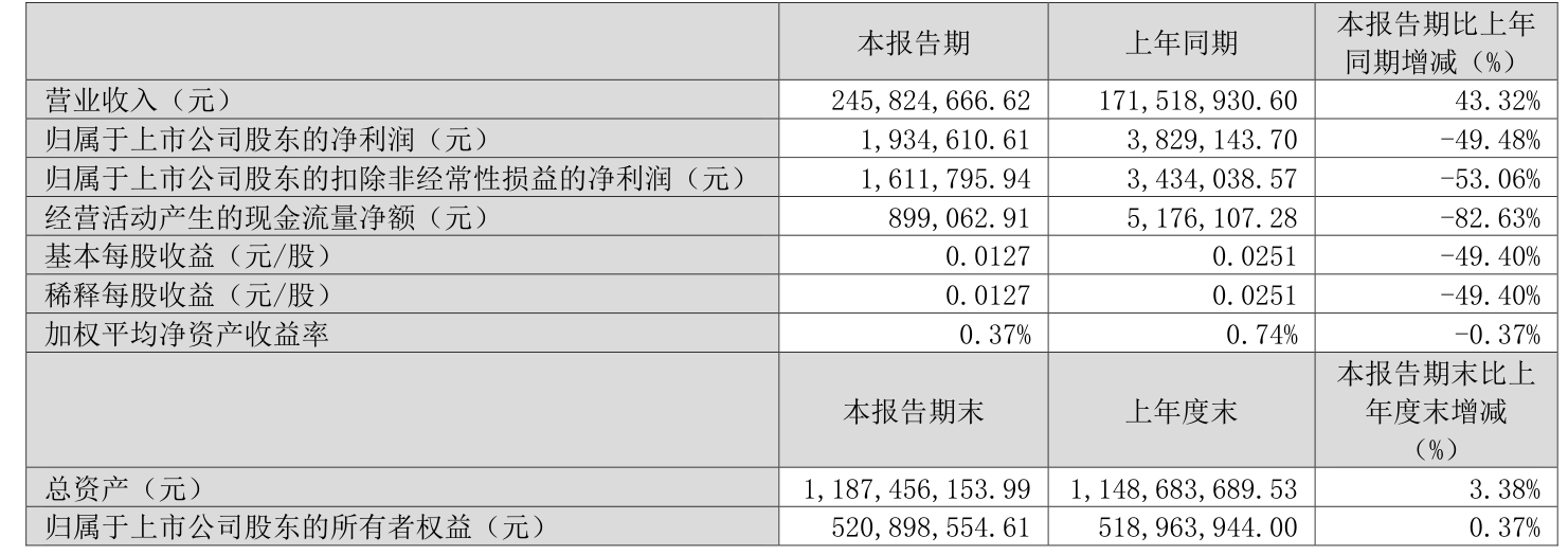 中证智能财讯天顺股份(维权)(002800)4月25日披露2025年第一季度报告。公司实现营业总收入2.46亿元,同比增长43.32%;归母净利润193.46万元,同比下降49.48%;扣非净利润161.18万元,同比下降53.06%;经营活动产生的现金流量净额为89.91万元,同比下降82.63%;报告期内,天顺股份基本每股收益为0.0127元,加权平均净资产收益率为0.37%。