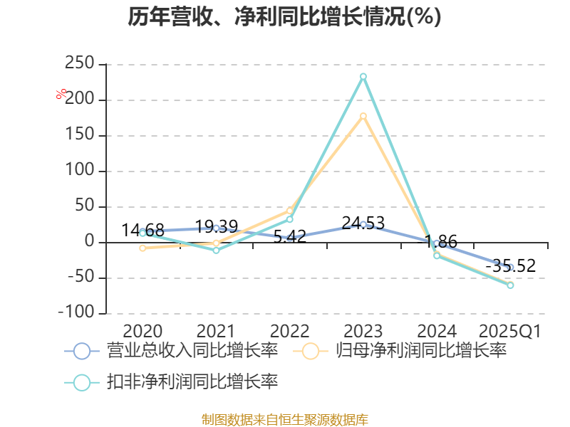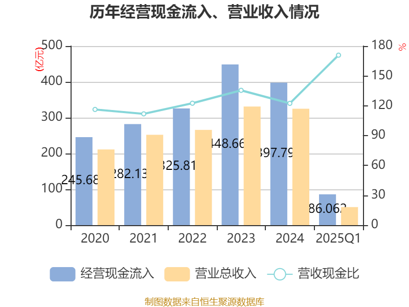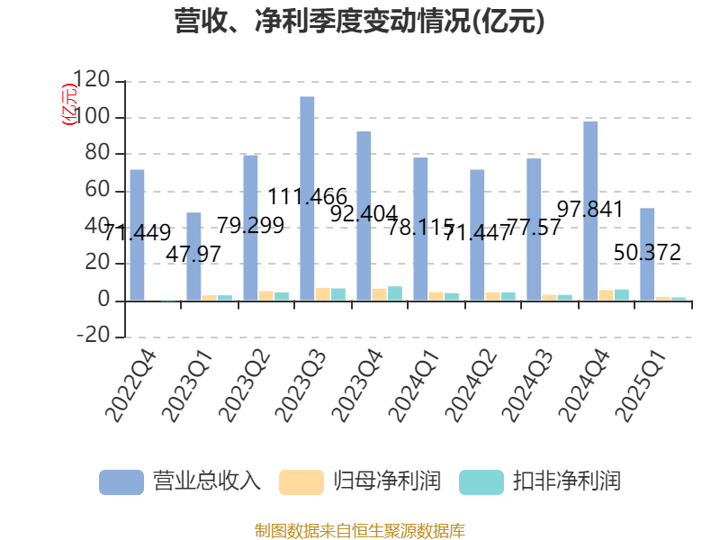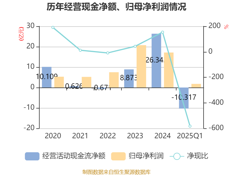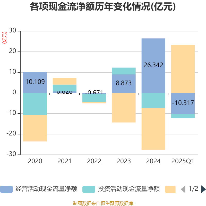 截至2025年一季度末,公司经营活动现金流净额为-10.32亿元,同比减少2303.84万元;筹资活动现金流净额23.15亿元,同比减少4.68亿元;投资活动现金流净额-1.95亿元,上年同期为-1.73亿元。