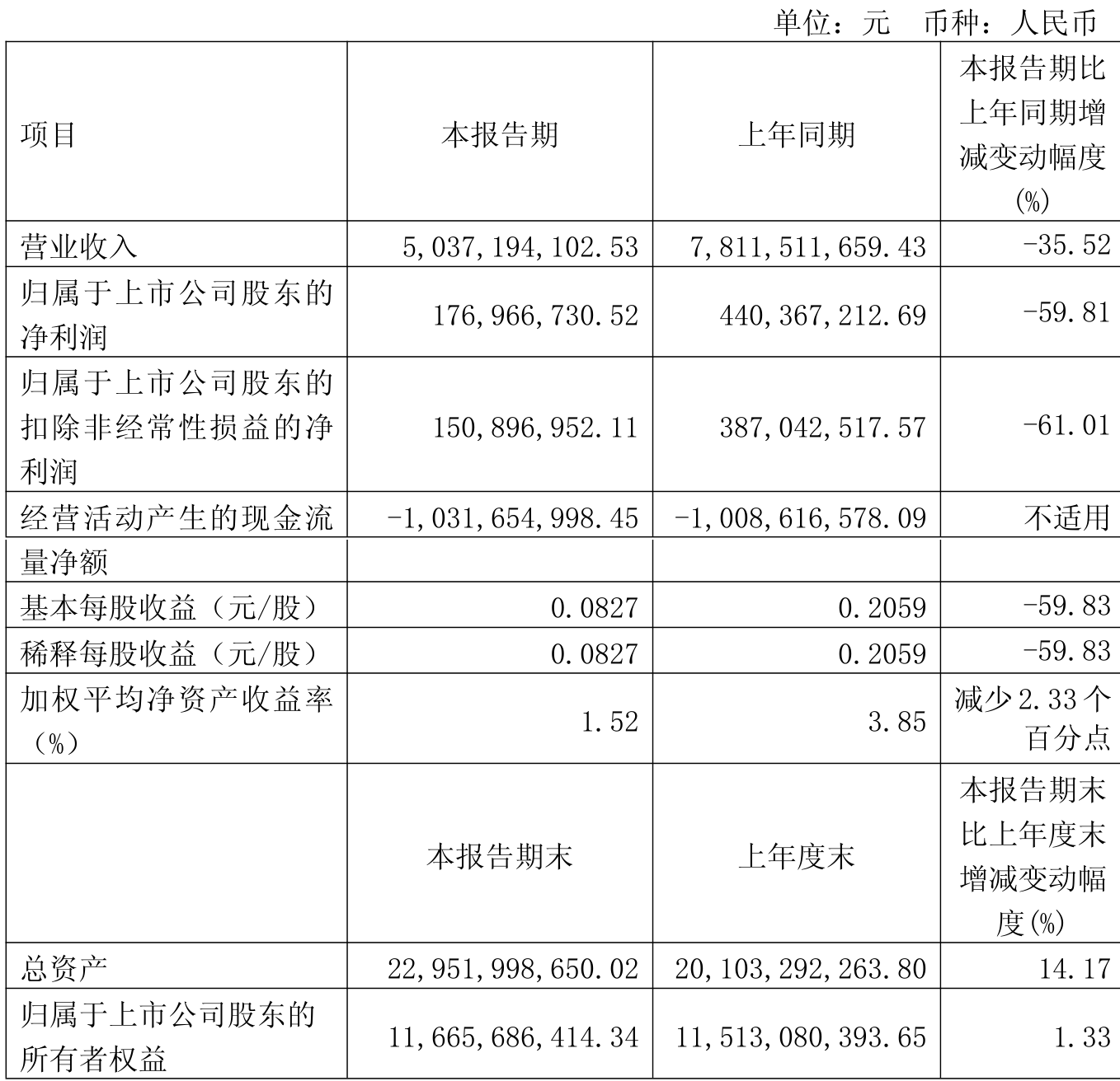 中证智能财讯中粮糖业(600737)4月25日披露2025年第一季度报告。公司实现营业总收入50.37亿元,同比下降35.52%;归母净利润1.77亿元,同比下降59.81%;扣非净利润1.51亿元,同比下降61.01%;经营活动产生的现金流量净额为-10.32亿元,上年同期为-10.09亿元;报告期内,中粮糖业基本每股收益为0.0827元,加权平均净资产收益率为1.52%。