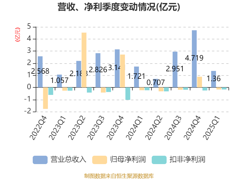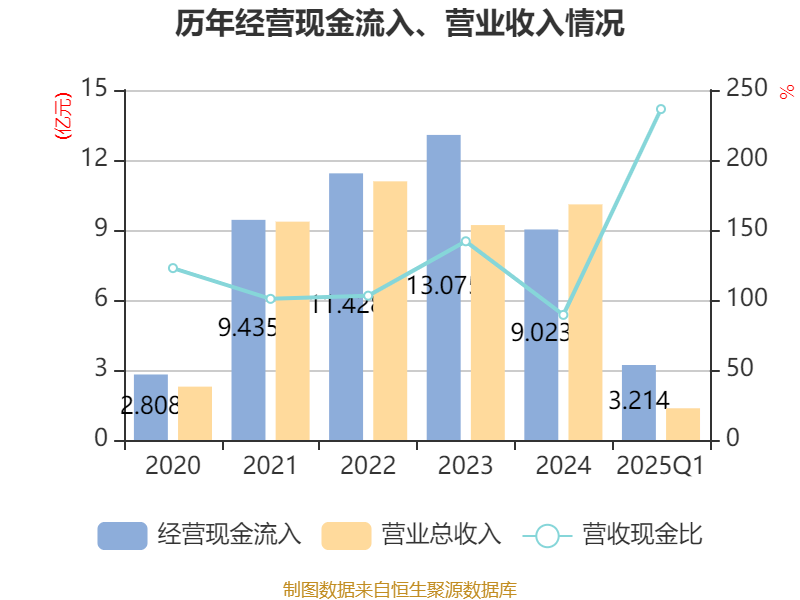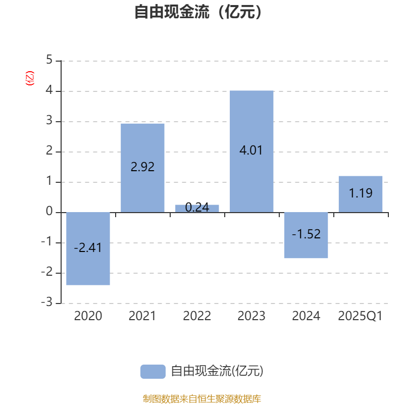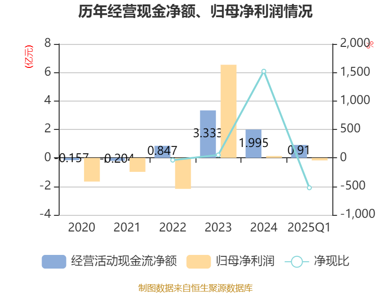 截至2025年一季度末,公司经营活动现金流净额为9104.58万元,同比增加1.03亿元;筹资活动现金流净额-1568.97万元,同比增加1.21亿元;投资活动现金流净额-1989.27万元,上年同期为-19.45万元。