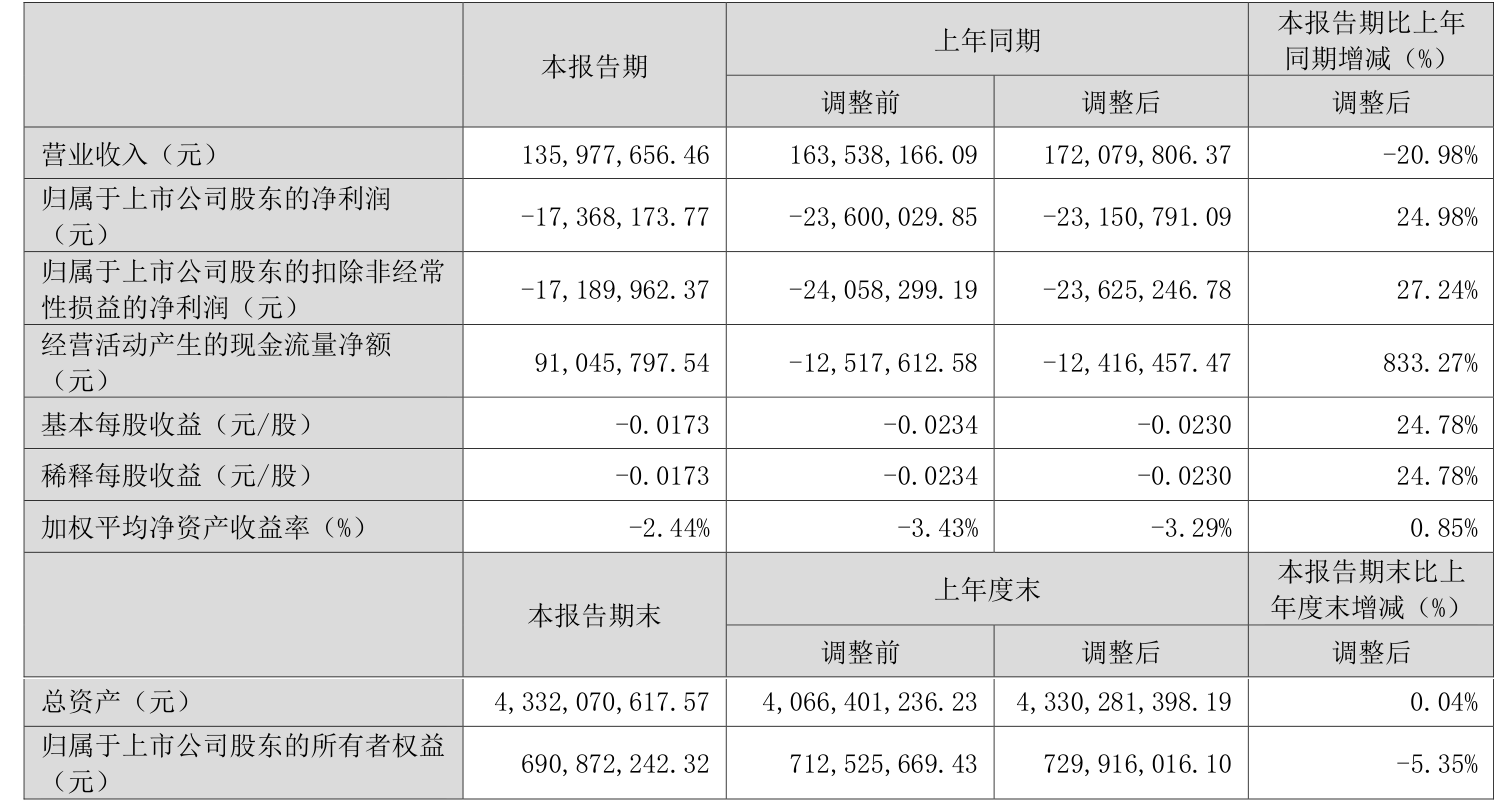 中证智能财讯华控赛格(维权)(000068)4月25日披露2025年第一季度报告。公司实现营业总收入1.36亿元,同比下降20.98%;归母净利润亏损1736.82万元,上年同期亏损2315.08万元;扣非净利润亏损1719万元,上年同期亏损2362.52万元;经营活动产生的现金流量净额为9104.58万元,上年同期为-1241.65万元;报告期内,华控赛格基本每股收益为-0.0173元,加权平均净资产收益率为-2.44%。