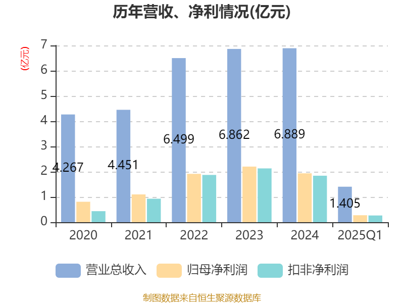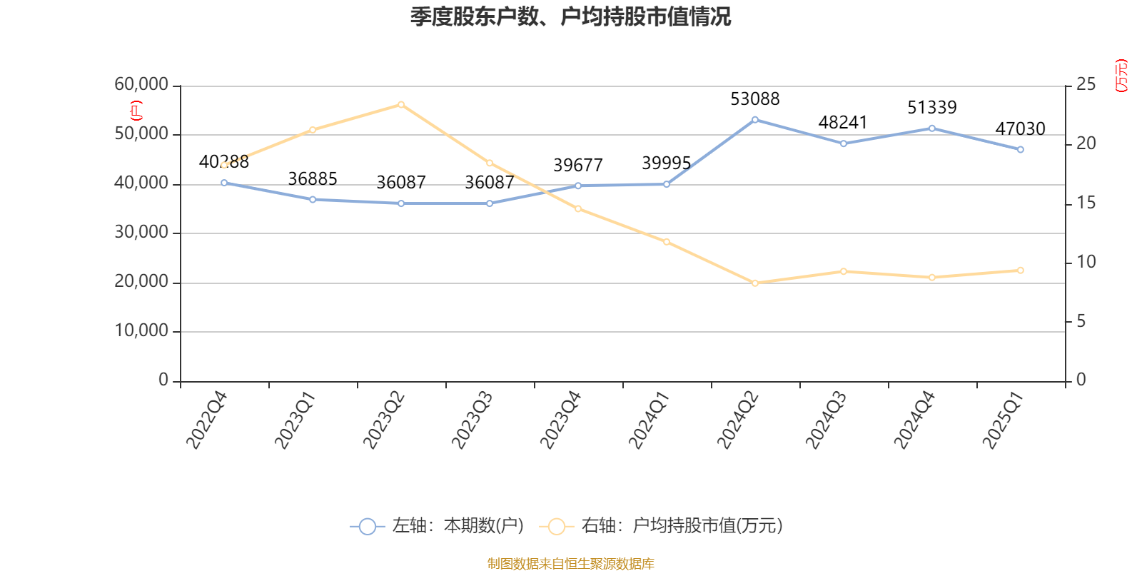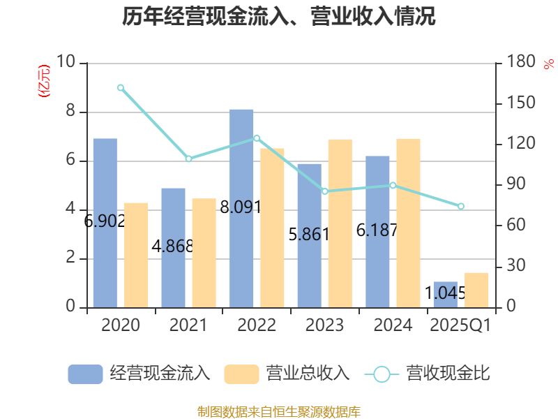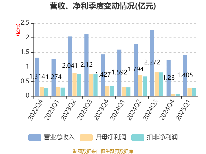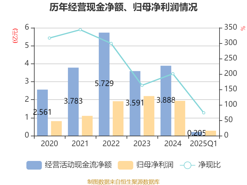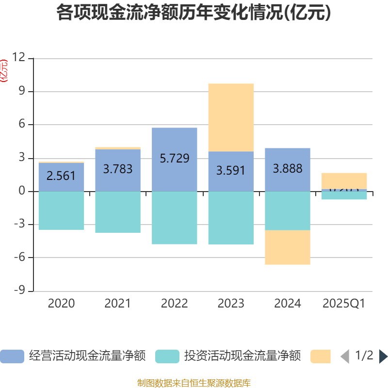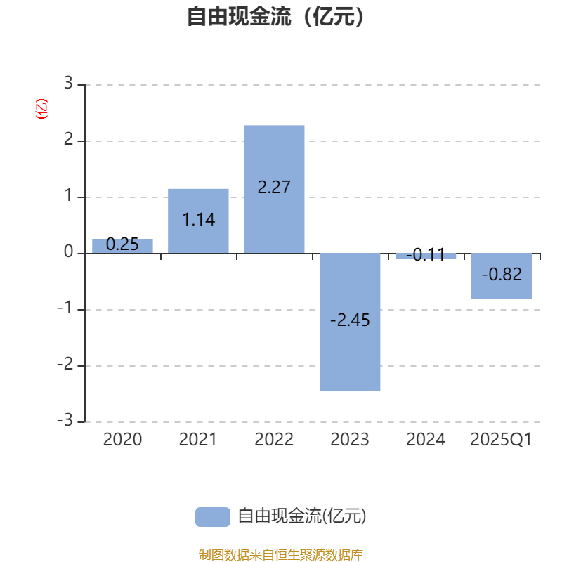 截至2025年一季度末,公司经营活动现金流净额为2045.64万元,同比下降23.09%;筹资活动现金流净额1.44亿元,同比增加1.44亿元;投资活动现金流净额-7409.11万元,上年同期为-9513.33万元。