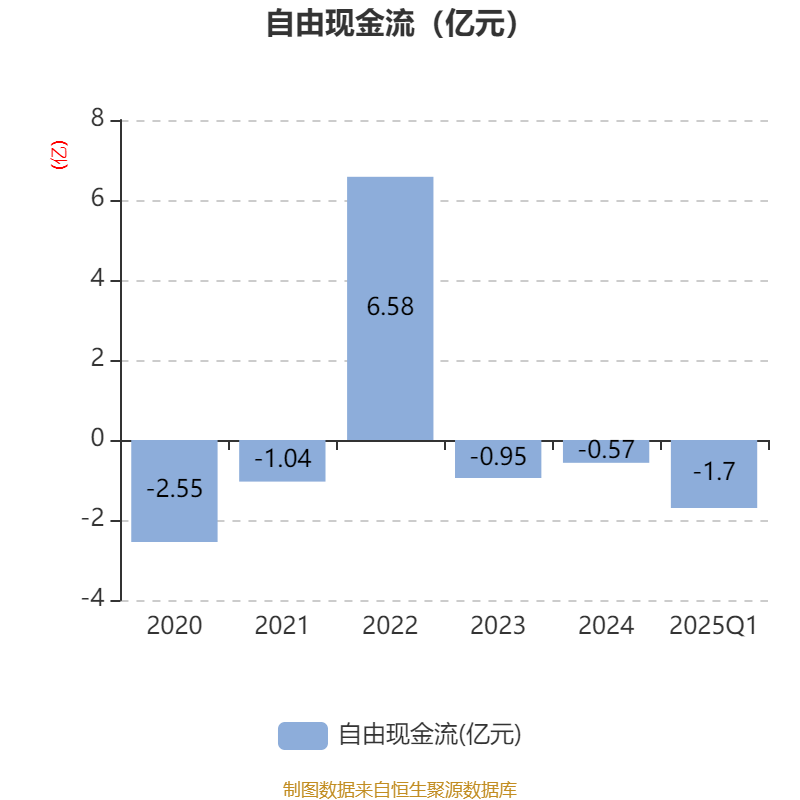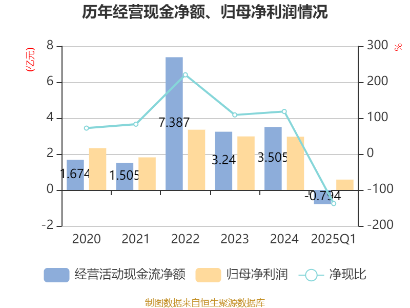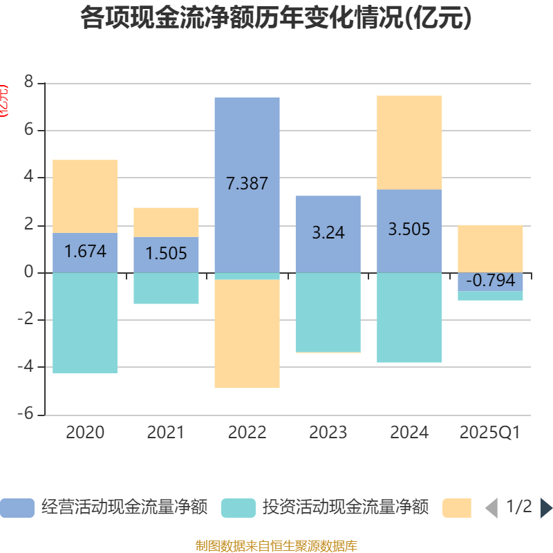 截至2025年一季度末,公司经营活动现金流净额为-7939.33万元,同比减少3347.69万元;筹资活动现金流净额2亿元,同比减少1.07亿元;投资活动现金流净额-3833.68万元,上年同期为-461.59万元。