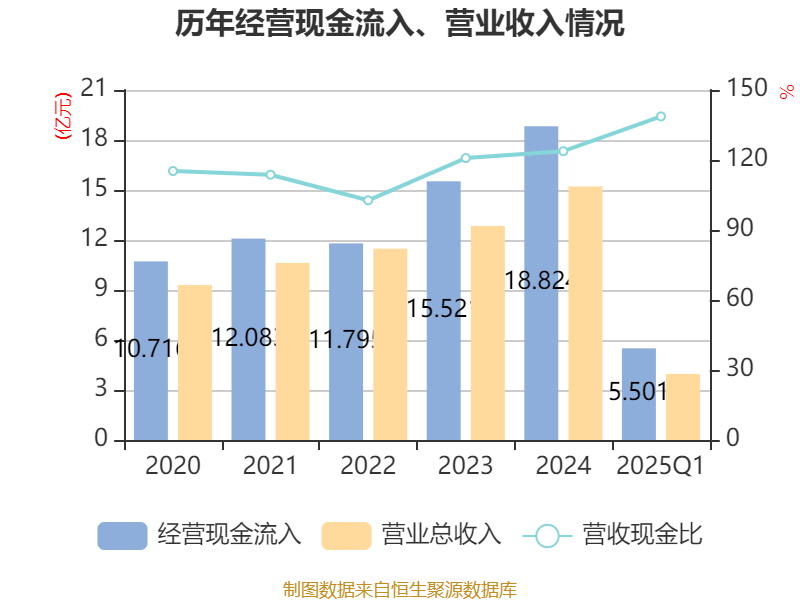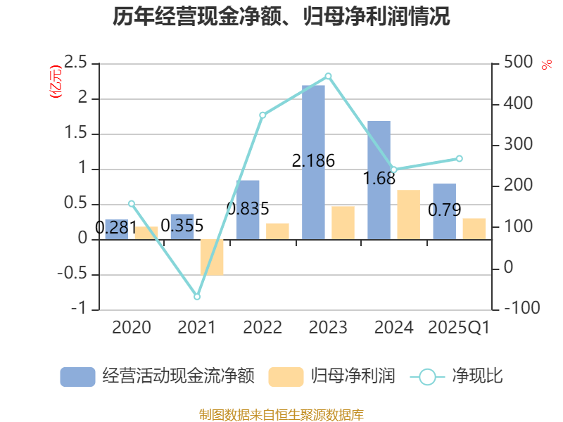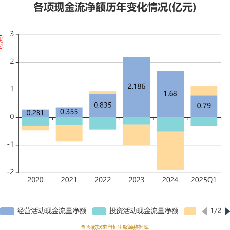 截至2025年一季度末,公司经营活动现金流净额为7898.99万元,同比下降8.36%;筹资活动现金流净额3361.01万元,同比增加1.1亿元;投资活动现金流净额-3233.56万元,上年同期为-574.03万元。