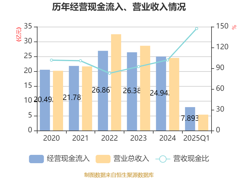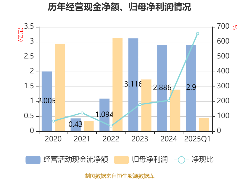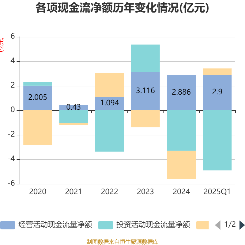 截至2025年一季度末,公司经营活动现金流净额为2.9亿元,同比增长452.03%;筹资活动现金流净额5150.28万元,同比增加9894.48万元;投资活动现金流净额-4.91亿元,上年同期为-2.95亿元。