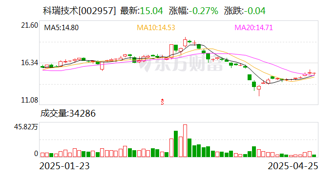 中证智能财讯科瑞技术(002957)4月25日披露2025年第一季度报告。公司实现营业总收入5.36亿元,同比下降1.57%;归母净利润4425.43万元,同比增长31.81%;扣非净利润4503.1万元,同比增长29.20%;经营活动产生的现金流量净额为2.9亿元,同比增长452.03%;报告期内,科瑞技术基本每股收益为0.1069元,加权平均净资产收益率为1.49%。