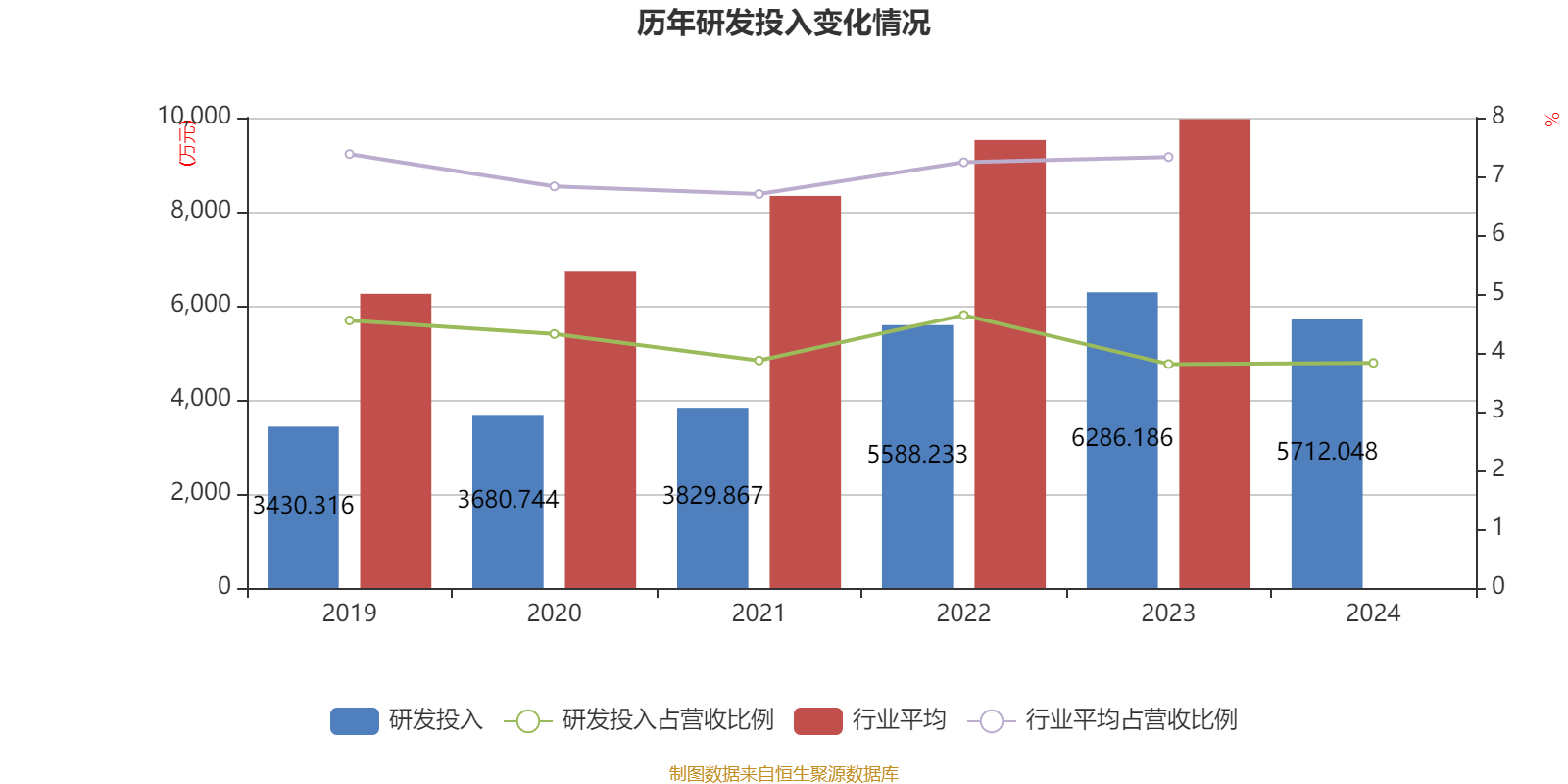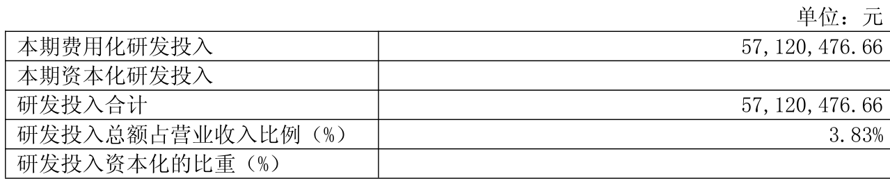 2024年全年,公司研发投入金额为5712.05万元,同比下降9.13%;研发投入占营业收入比例为3.83%,相比上年同期上升0.02个百分点。此外,公司全年研发投入资本化率为0%。