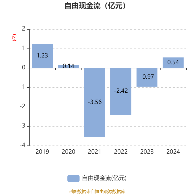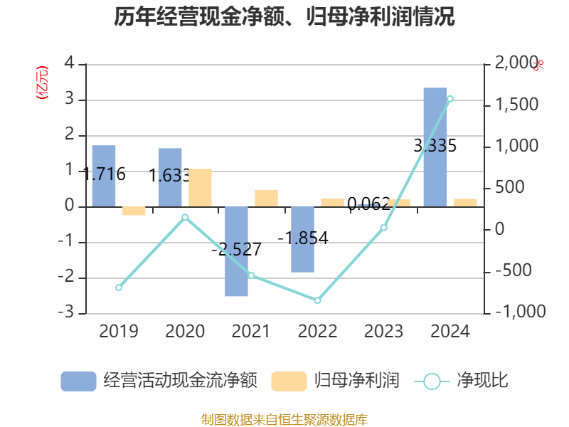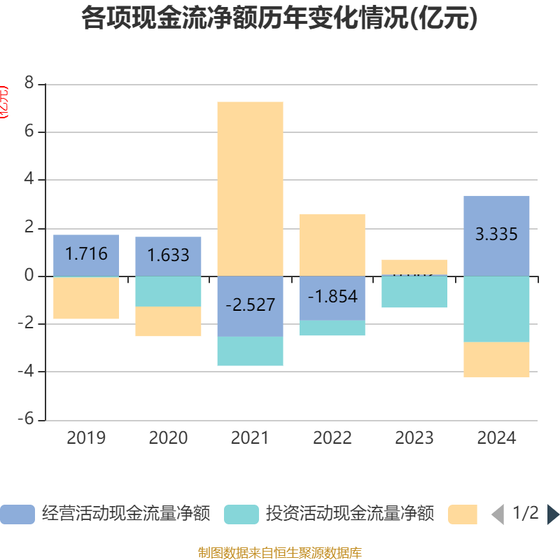 截至2024年,公司经营活动现金流净额为3.34亿元,同比增长5321.62%;筹资活动现金流净额-1.46亿元,同比减少2.07亿元;投资活动现金流净额-2.76亿元,上年同期为-1.31亿元。