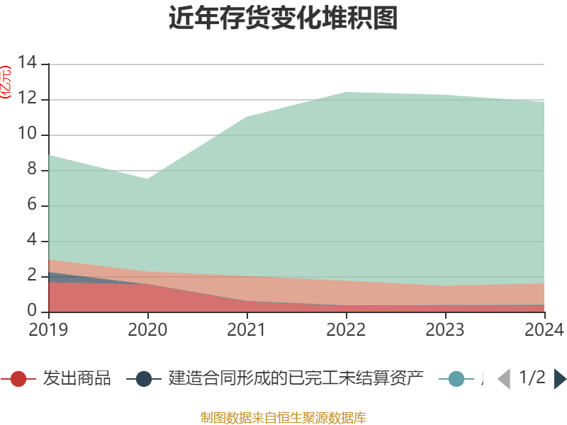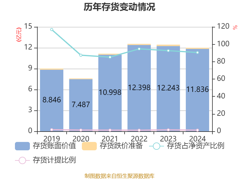 从存货变动来看,截至2024年末,公司存货账面价值为11.84亿元,占净资产的90.51%,较上年末减少4075.07万元。其中,存货跌价准备为1530.79万元,计提比例为1.28%。