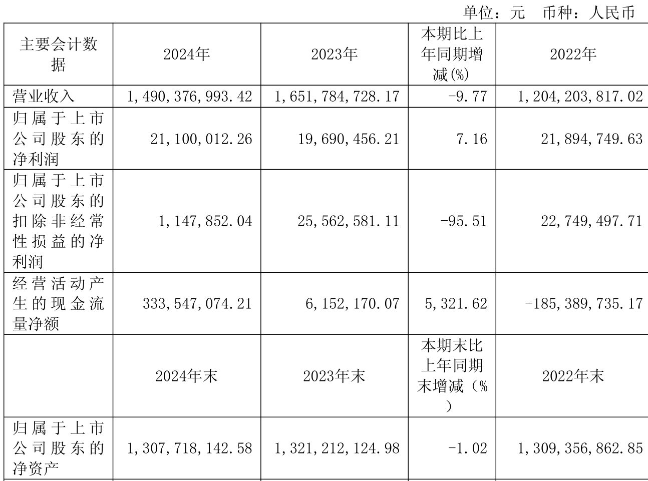 中证智能财讯乐惠国际(603076)4月25日披露2024年年度报告。2024年,公司实现营业总收入14.9亿元,同比下降9.77%;归母净利润2110万元,同比增长7.16%;扣非净利润114.79万元,同比下降95.51%;经营活动产生的现金流量净额为3.34亿元,同比增长5321.62%;报告期内,乐惠国际基本每股收益为0.17元,加权平均净资产收益率为1.61%。公司2024年度分配预案为:拟向全体股东每10股派现4元(含税)。