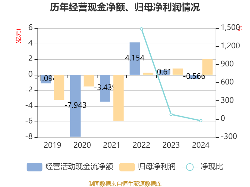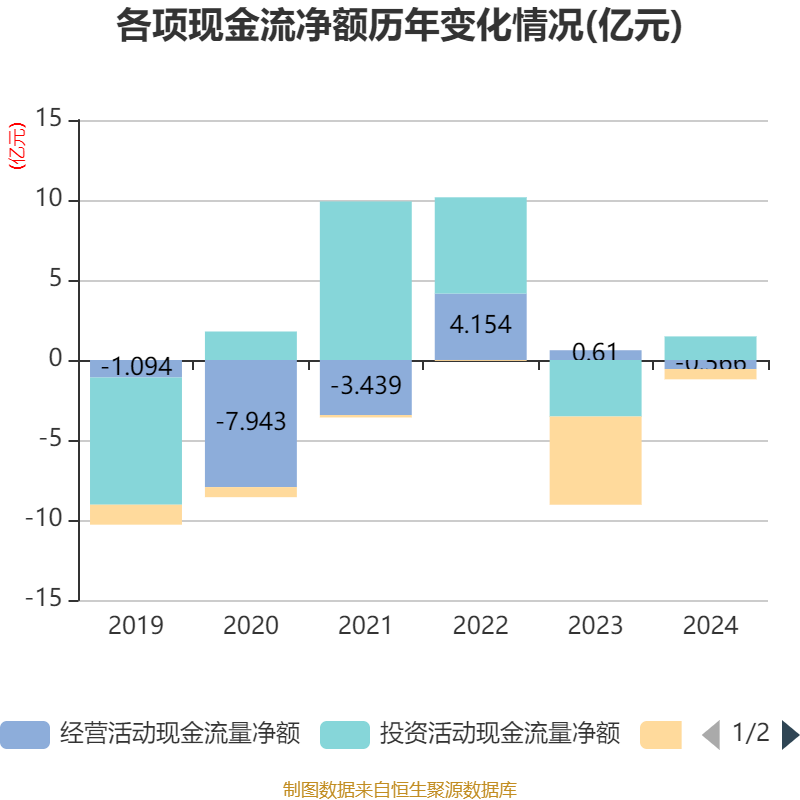 截至2024年,公司经营活动现金流净额为-5657.4万元,同比减少1.18亿元;筹资活动现金流净额-6407.47万元,同比增加4.87亿元;投资活动现金流净额1.47亿元,上年同期为-3.53亿元。