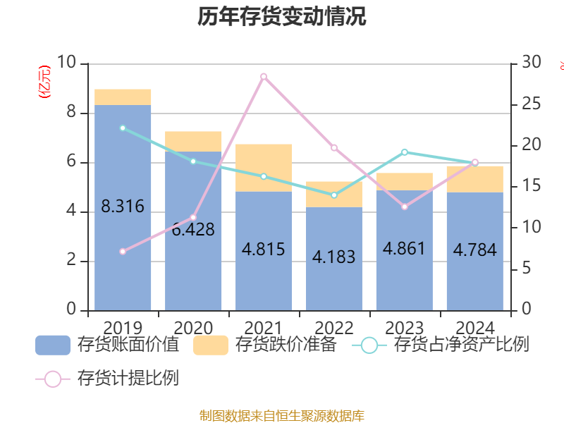 从存货变动来看,截至2024年末,公司存货账面价值为4.78亿元,占净资产的17.88%,较上年末减少770.63万元。其中,存货跌价准备为1.05亿元,计提比例为17.99%。