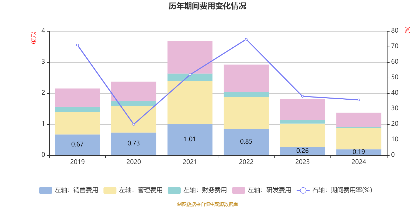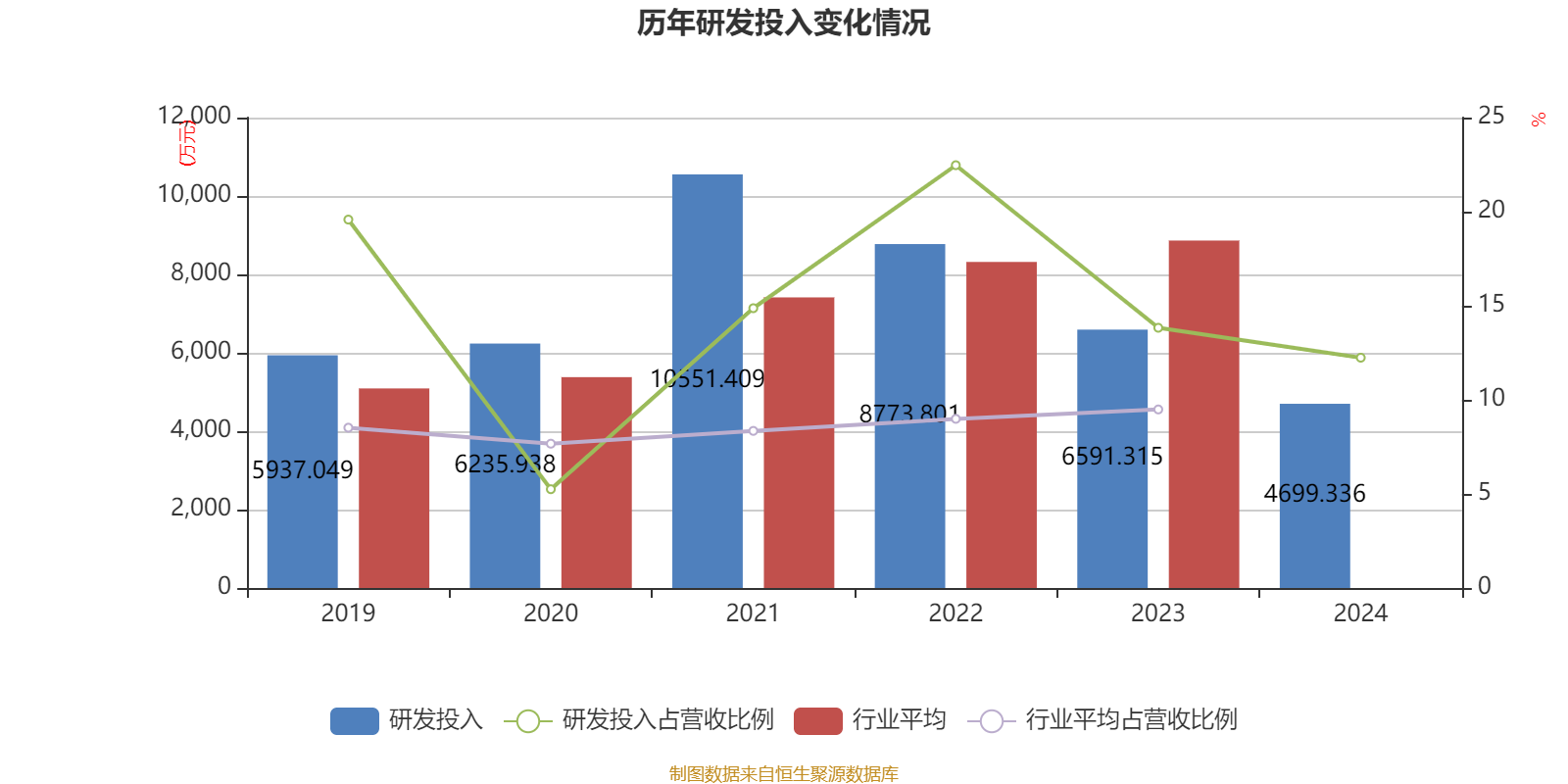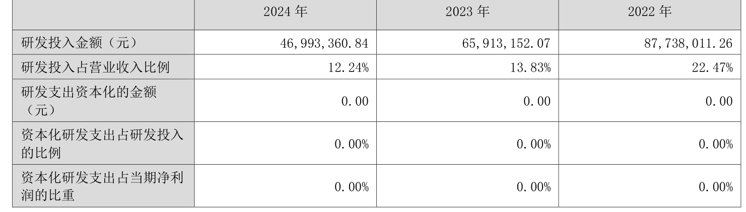 2024年全年,公司研发投入金额为4699.34万元,同比下降28.7%;研发投入占营业收入比例为12.24%,相比上年同期下降1.59个百分点。此外,公司全年研发投入资本化率为0%。