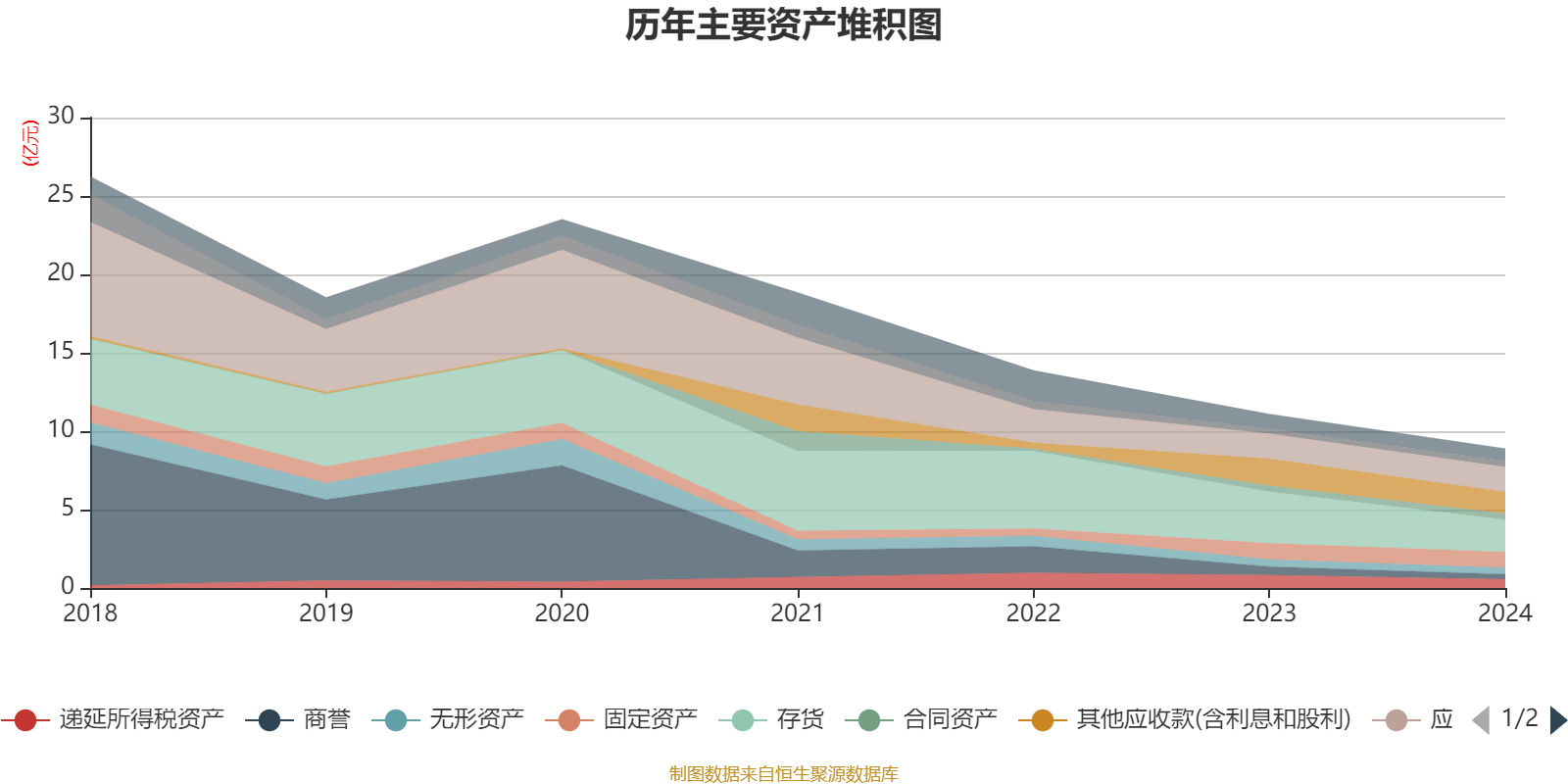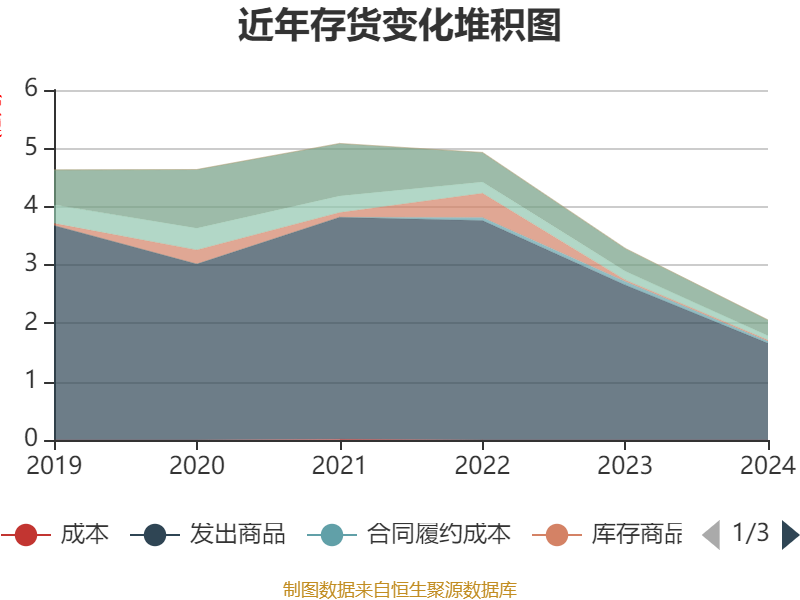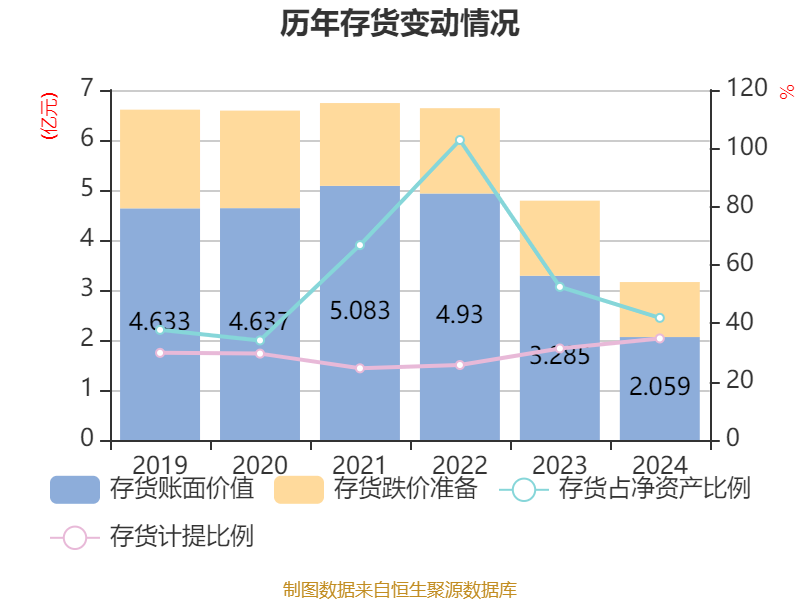 从存货变动来看,截至2024年末,公司存货账面价值为2.06亿元,占净资产的41.88%,较上年末减少1.23亿元。其中,存货跌价准备为1.1亿元,计提比例为34.82%。
