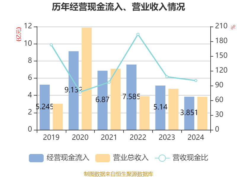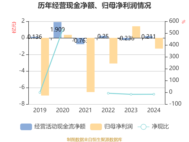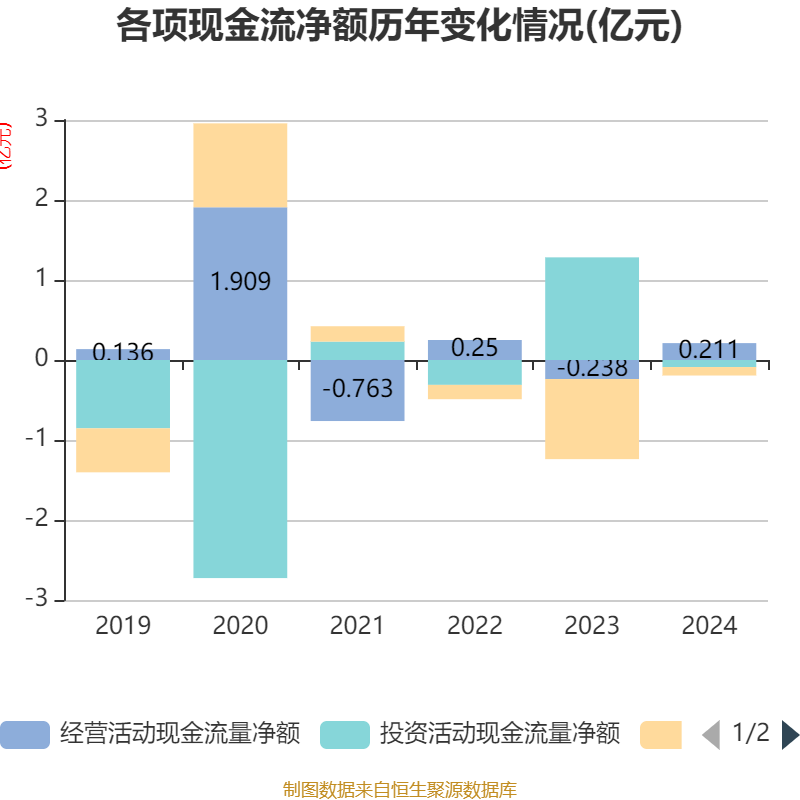 截至2024年,公司经营活动现金流净额为2109.09万元,同比增加4487.58万元;筹资活动现金流净额-1064.4万元,同比增加8946.63万元;投资活动现金流净额-883.29万元,上年同期为1.28亿元。