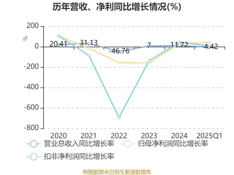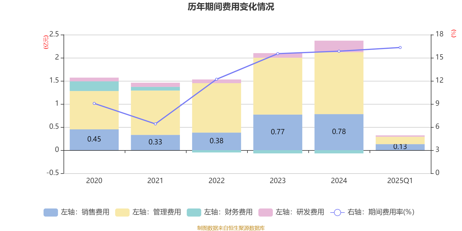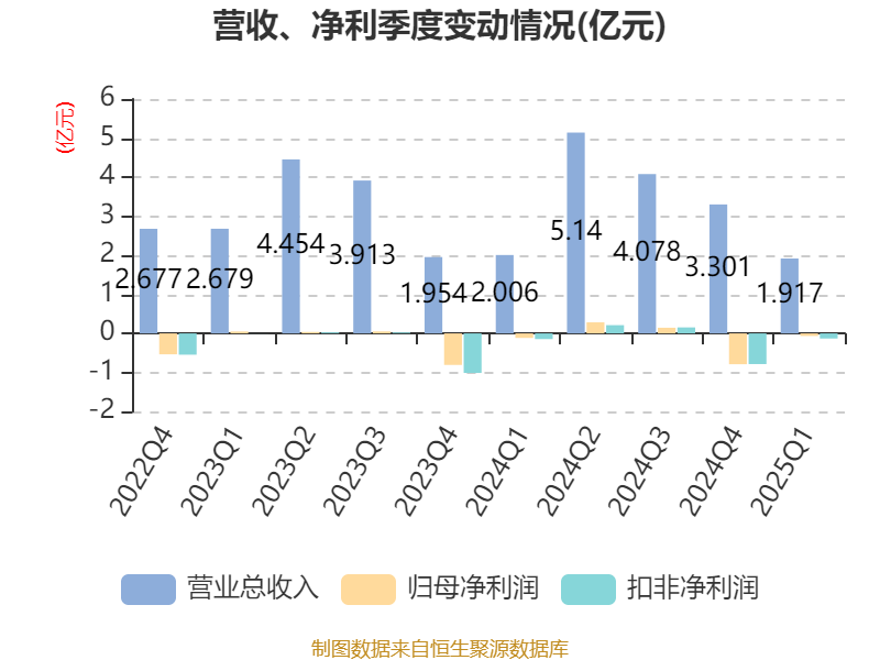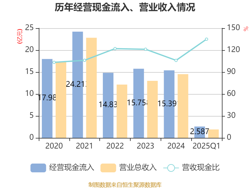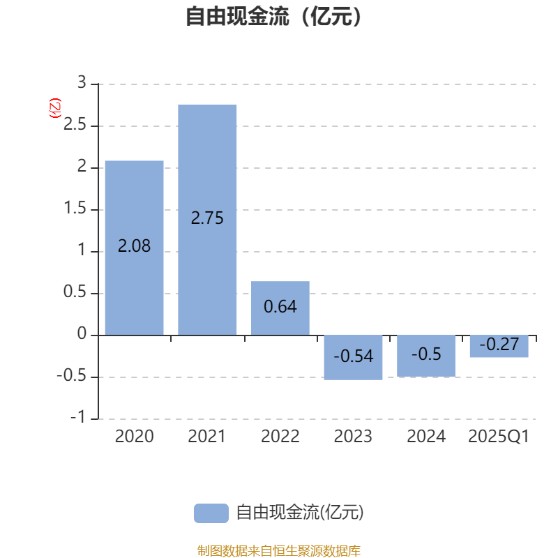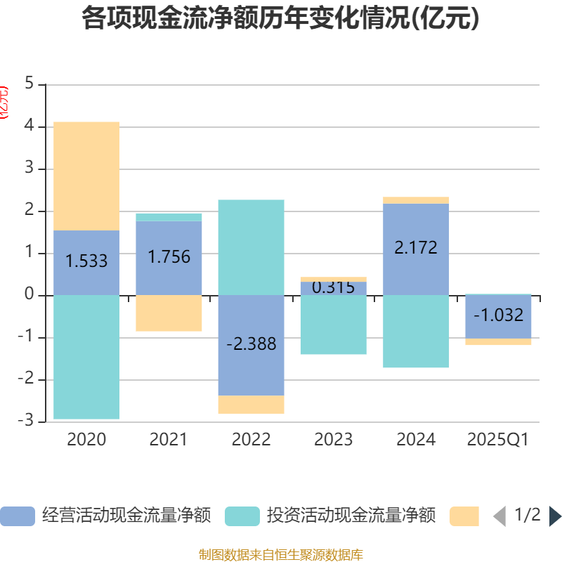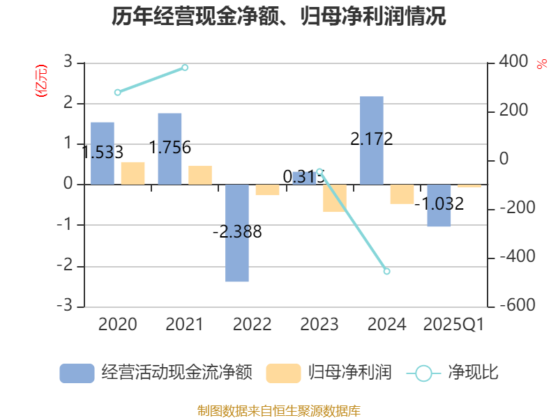 截至2025年一季度末,公司经营活动现金流净额为-1.03亿元,同比减少2212.4万元;筹资活动现金流净额-1533.8万元,同比减少42.56万元;投资活动现金流净额268.76万元,上年同期为-1029.12万元。