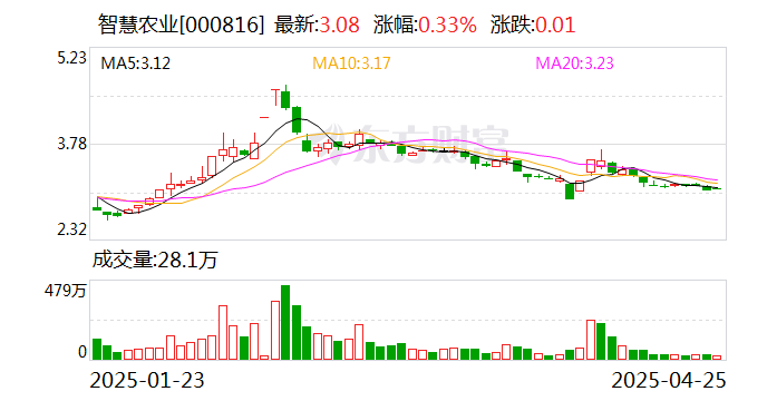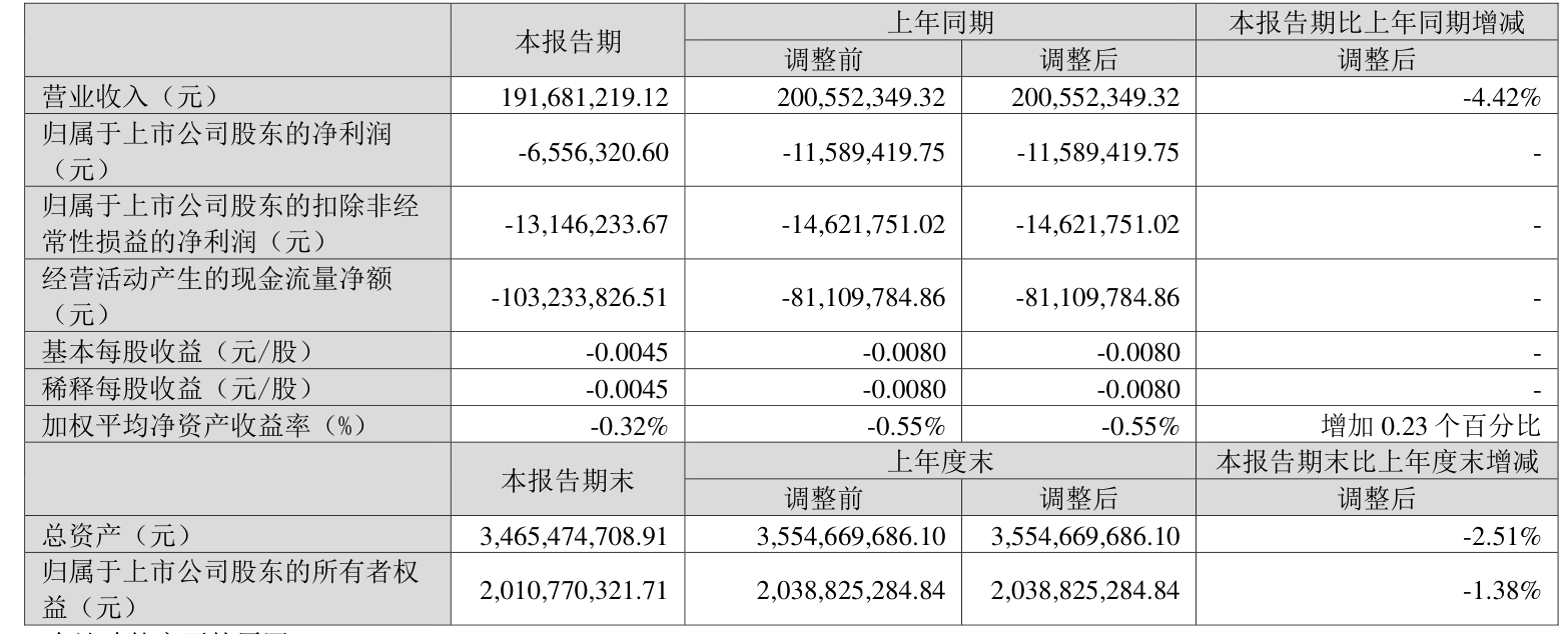 中证智能财讯智慧农业(000816)4月26日披露2025年第一季度报告。公司实现营业总收入1.92亿元,同比下降4.42%;归母净利润亏损655.63万元,上年同期亏损1158.94万元;扣非净利润亏损1314.62万元,上年同期亏损1462.18万元;经营活动产生的现金流量净额为-1.03亿元,上年同期为-8110.98万元;报告期内,智慧农业基本每股收益为-0.0045元,加权平均净资产收益率为-0.32%。