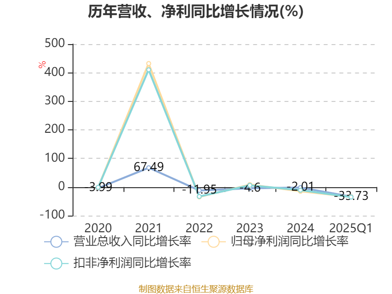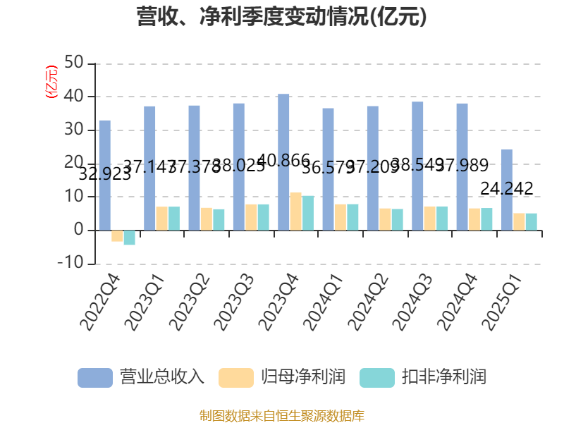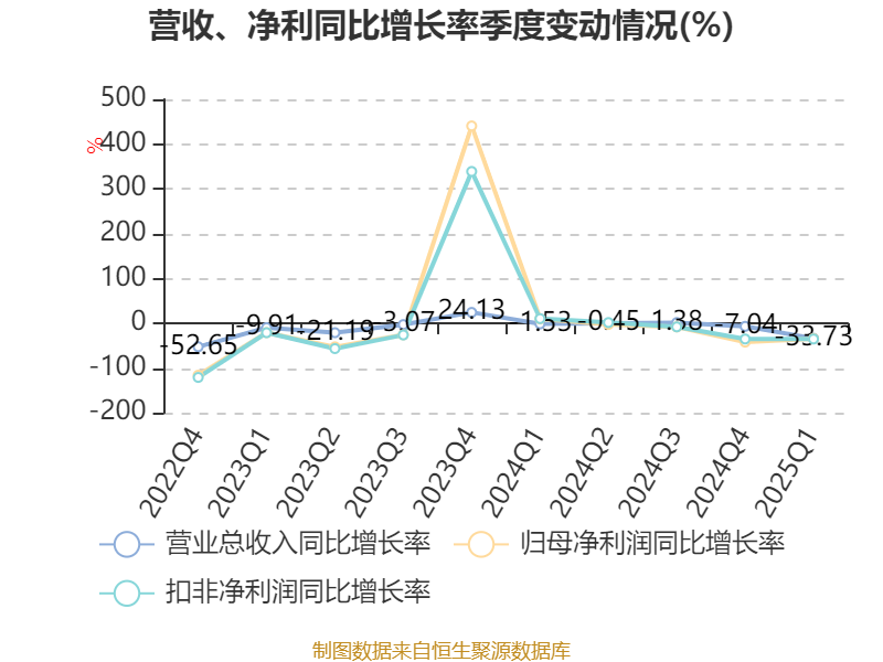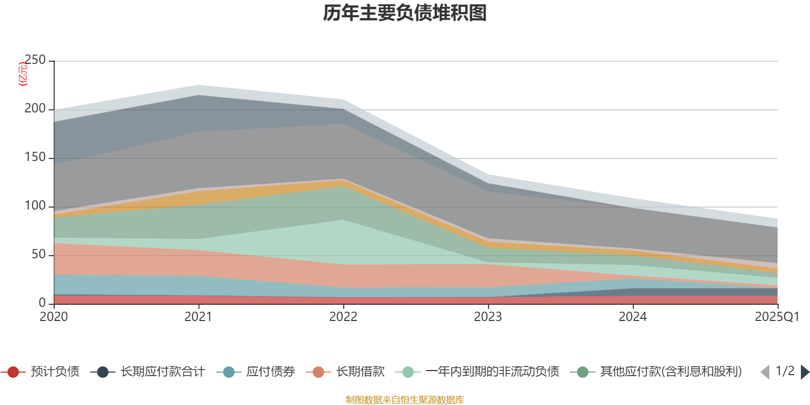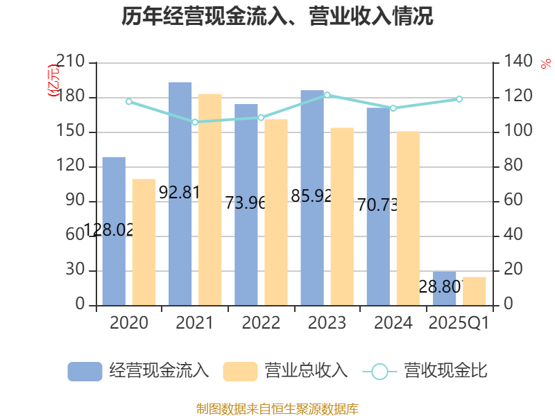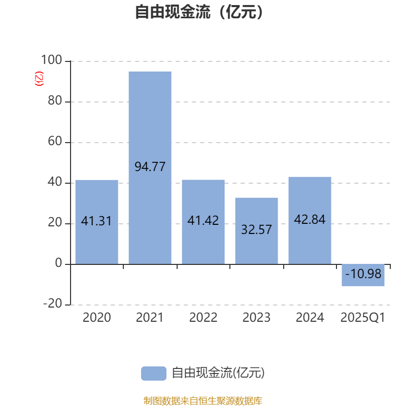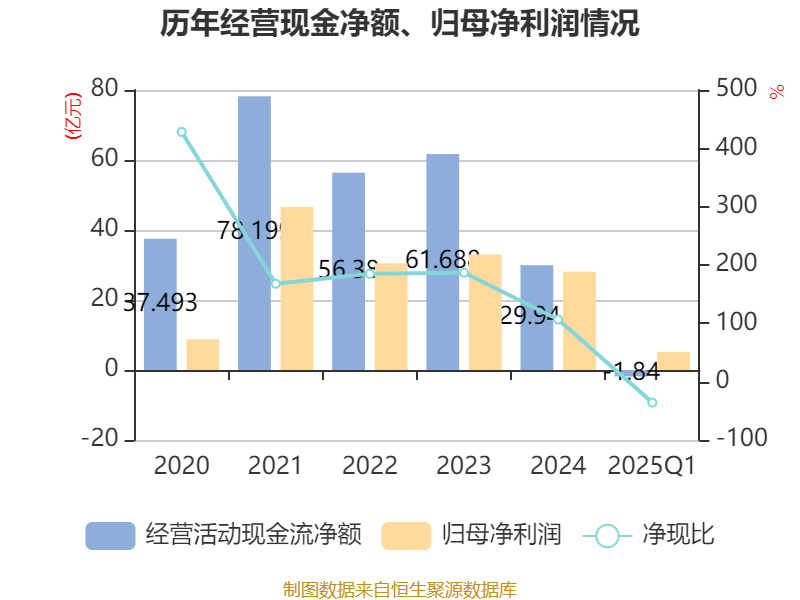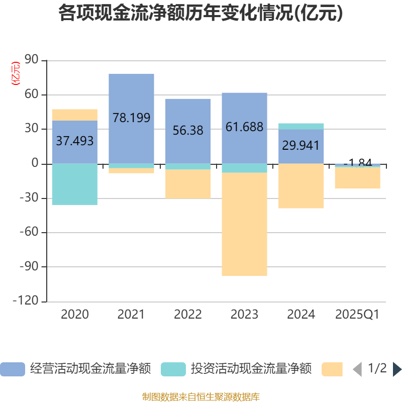 截至2025年一季度末,公司经营活动现金流净额为-1.84亿元,同比减少13.23亿元;筹资活动现金流净额-18.51亿元,同比减少16.88亿元;投资活动现金流净额-1.27亿元,上年同期为-9729.41万元。