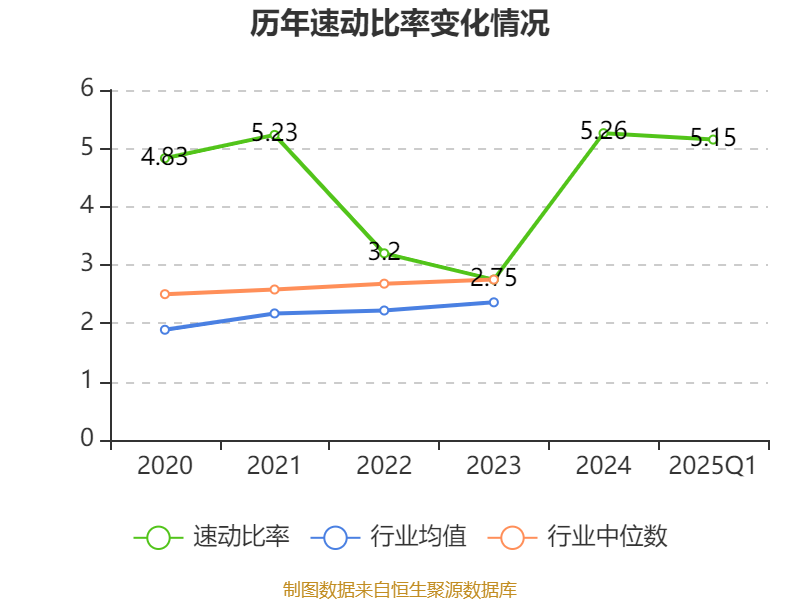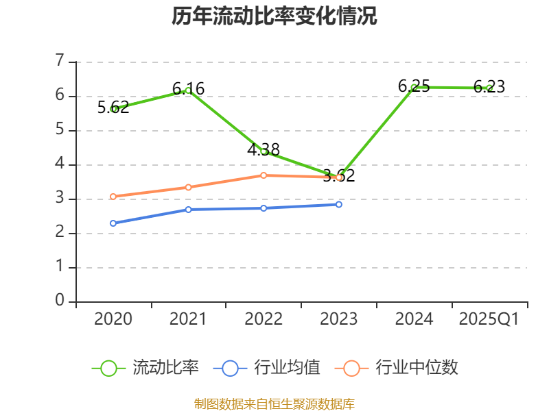 2025年第一季度,公司流动比率为6.23,速动比率为5.15。