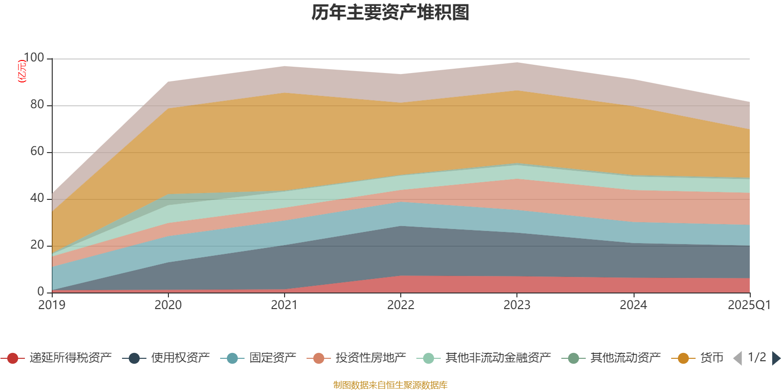资产重大变化方面,截至2025年一季度末,公司货币资金较上年末减少29.78%,占公司总资产比重下降6.92个百分点;投资性房地产较上年末增加0.23%,占公司总资产比重上升1.82个百分点;固定资产较上年末减少1.65%,占公司总资产比重上升0.99个百分点;使用权资产较上年末减少5.85%,占公司总资产比重上升0.86个百分点。