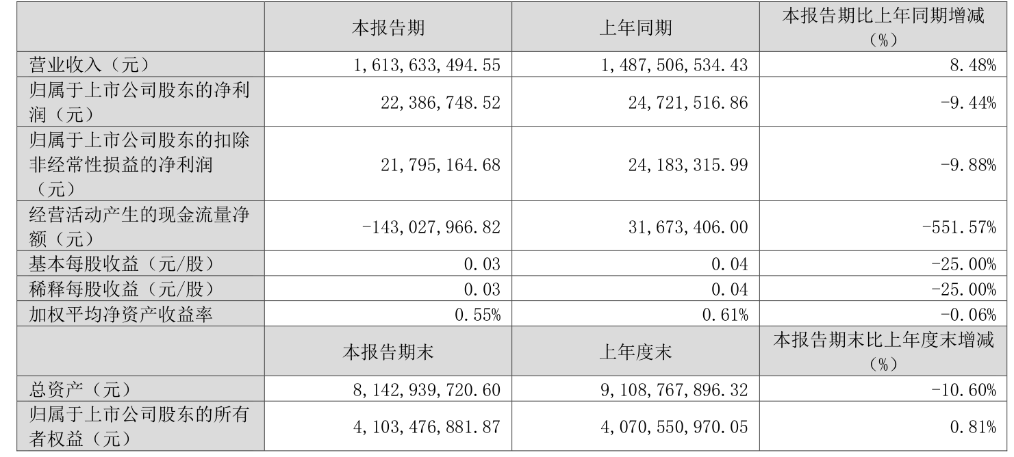 中证智能财讯广百股份(002187)4月26日披露2025年第一季度报告。公司实现营业总收入16.14亿元,同比增长8.48%;归母净利润2238.67万元,同比下降9.44%;扣非净利润2179.52万元,同比下降9.88%;经营活动产生的现金流量净额为-1.43亿元,上年同期为3167.34万元;报告期内,广百股份基本每股收益为0.03元,加权平均净资产收益率为0.55%。