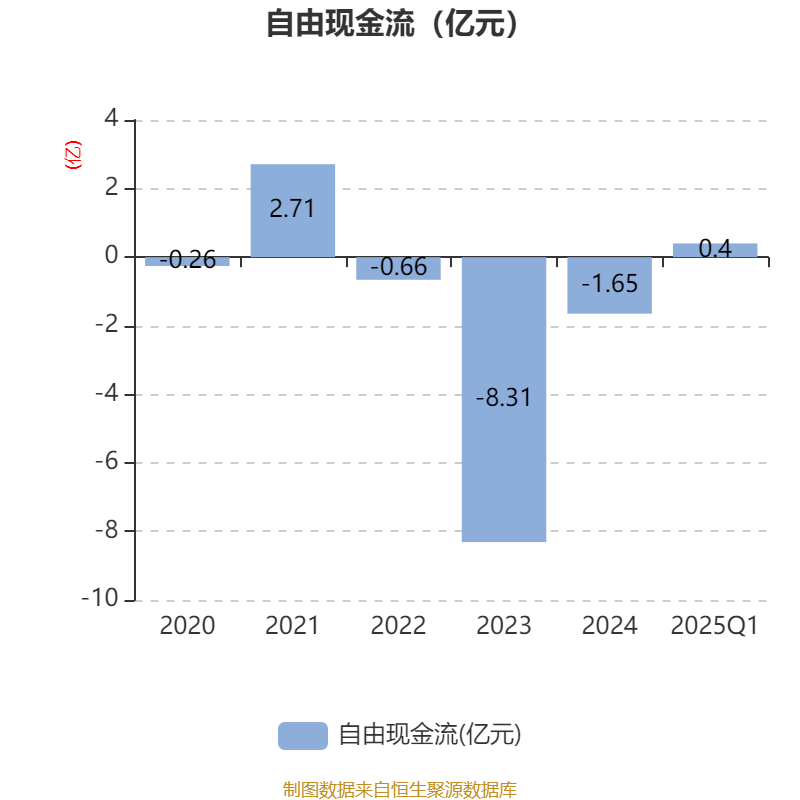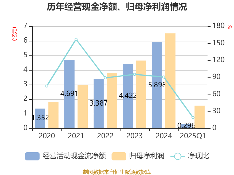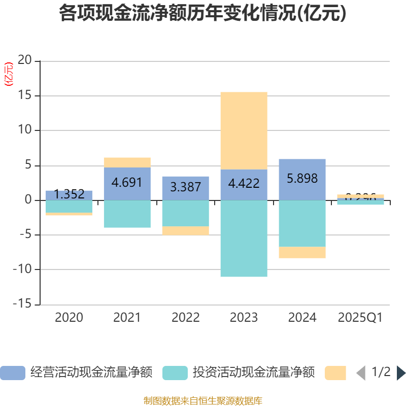 截至2025年一季度末,公司经营活动现金流净额为2962.55万元,同比下降71.86%;筹资活动现金流净额5092.21万元,同比增加7911.23万元;投资活动现金流净额-6497.54万元,上年同期为2309.17万元。