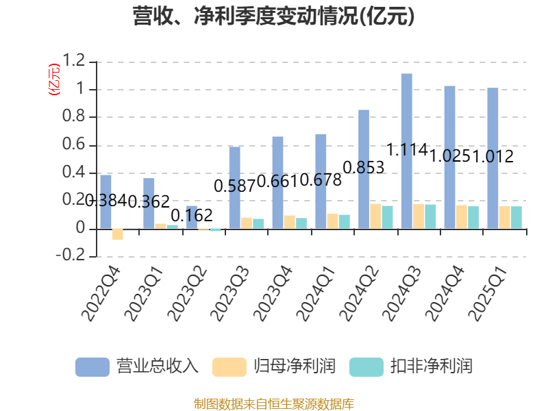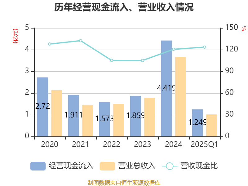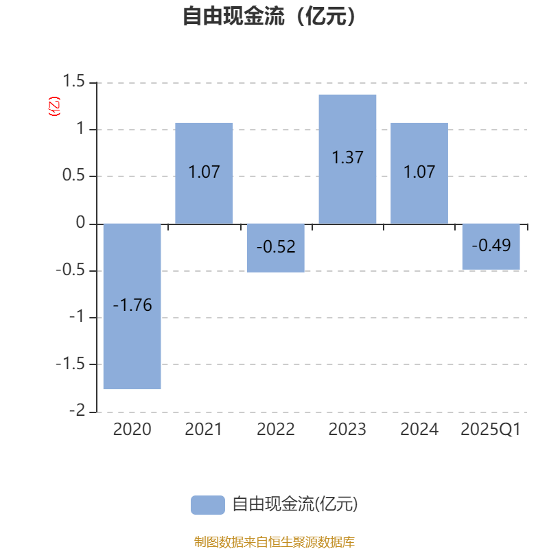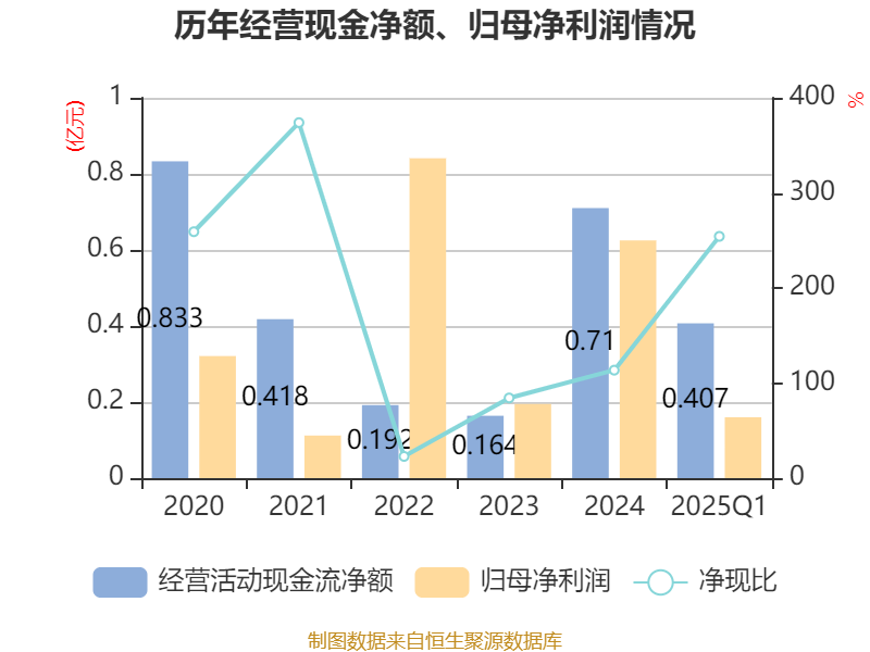 截至2025年一季度末,公司经营活动现金流净额为4069.96万元,同比增长167.54%;筹资活动现金流净额-9.52万元,同比增加5433.62万元;投资活动现金流净额-7433.55万元,上年同期为-5094.79万元。