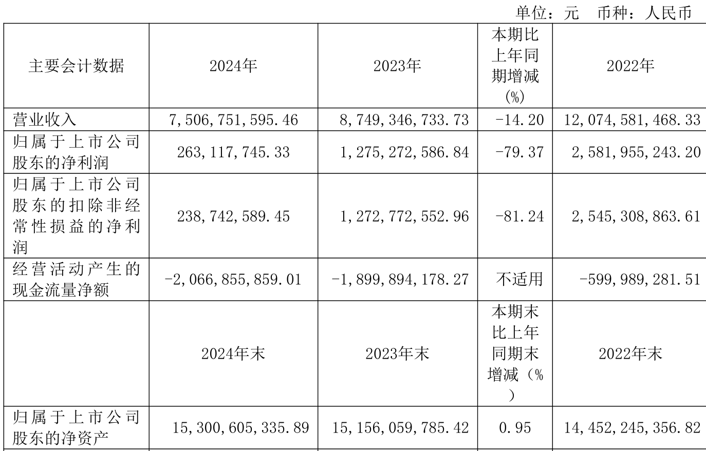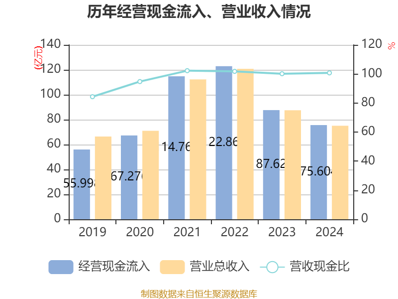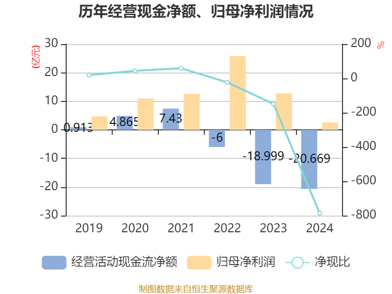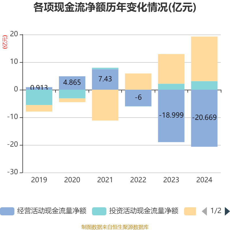 截至2024年,公司经营活动现金流净额为-20.67亿元,同比减少1.67亿元;筹资活动现金流净额16.15亿元,同比增加5.4亿元;投资活动现金流净额3.09亿元,上年同期为2.16亿元。