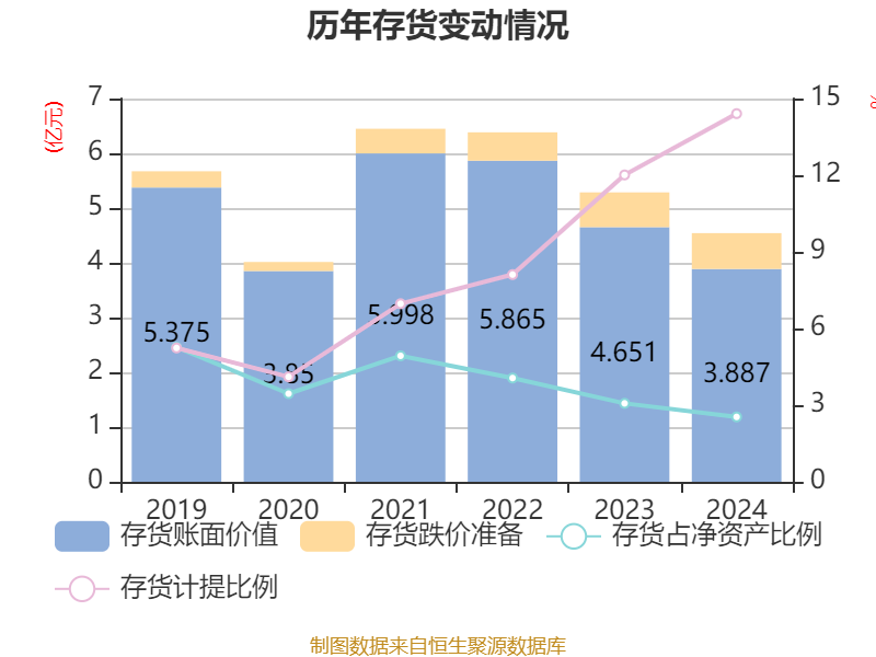 从存货变动来看,截至2024年末,公司存货账面价值为3.89亿元,占净资产的2.54%,较上年末减少7640.34万元。其中,存货跌价准备为6545.09万元,计提比例为14.41%。