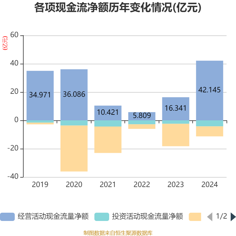 截至2024年,公司经营活动现金流净额为42.14亿元,同比增长157.9%;筹资活动现金流净额-7.08亿元,同比增加8.77亿元;投资活动现金流净额-4.23亿元,上年同期为-2.42亿元。
