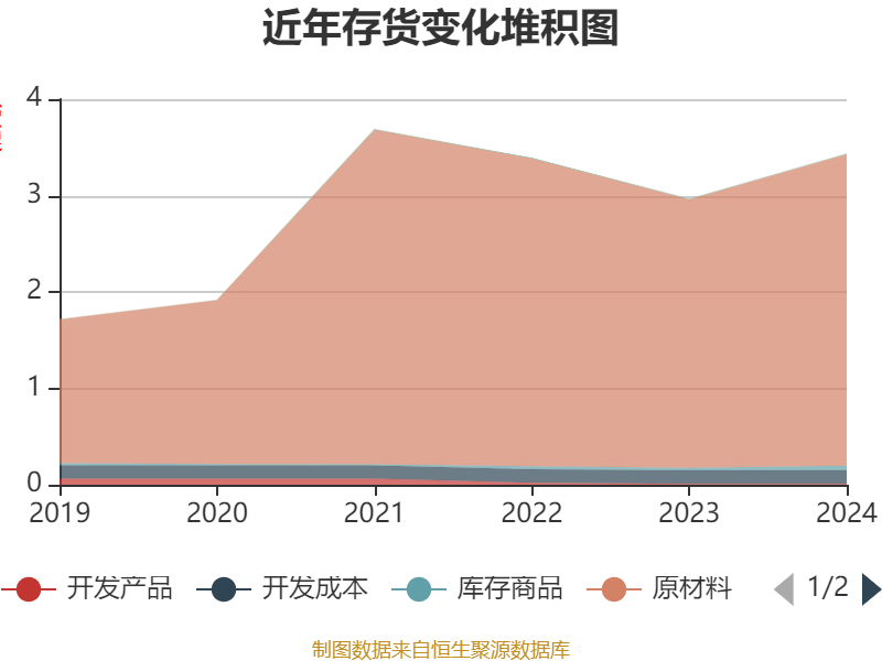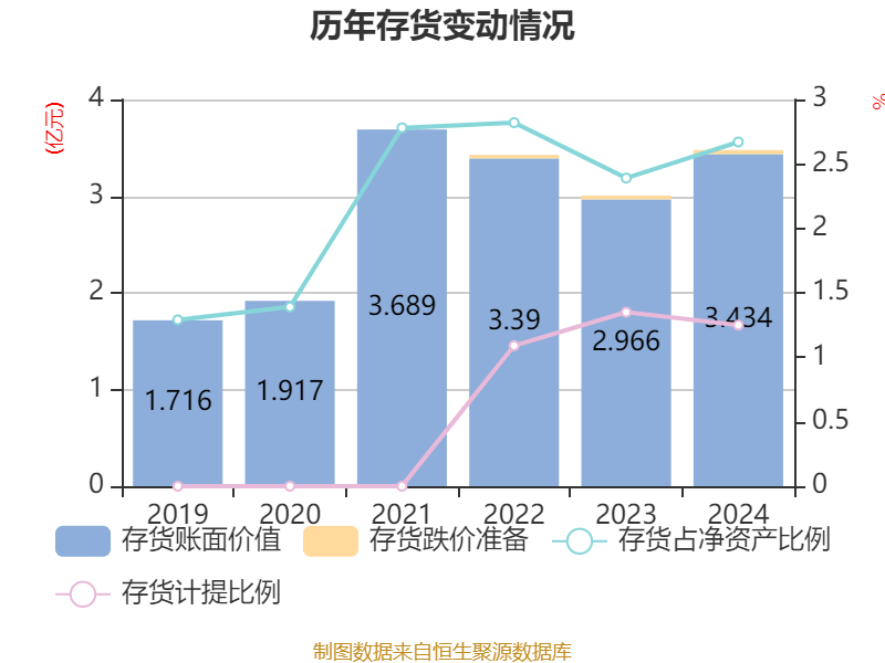 从存货变动来看,截至2024年末,公司存货账面价值为3.43亿元,占净资产的2.67%,较上年末增加4683.63万元。其中,存货跌价准备为433.85万元,计提比例为1.25%。