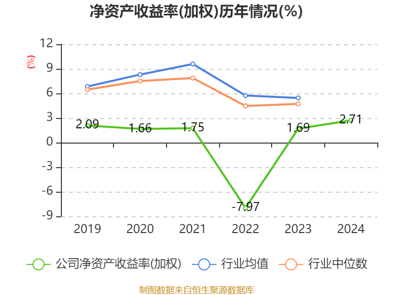 数据显示,2024年公司加权平均净资产收益率为2.71%,较上年同期上升1.02个百分点。公司2024年投入资本回报率为0.86%,较上年同期上升0.33个百分点。