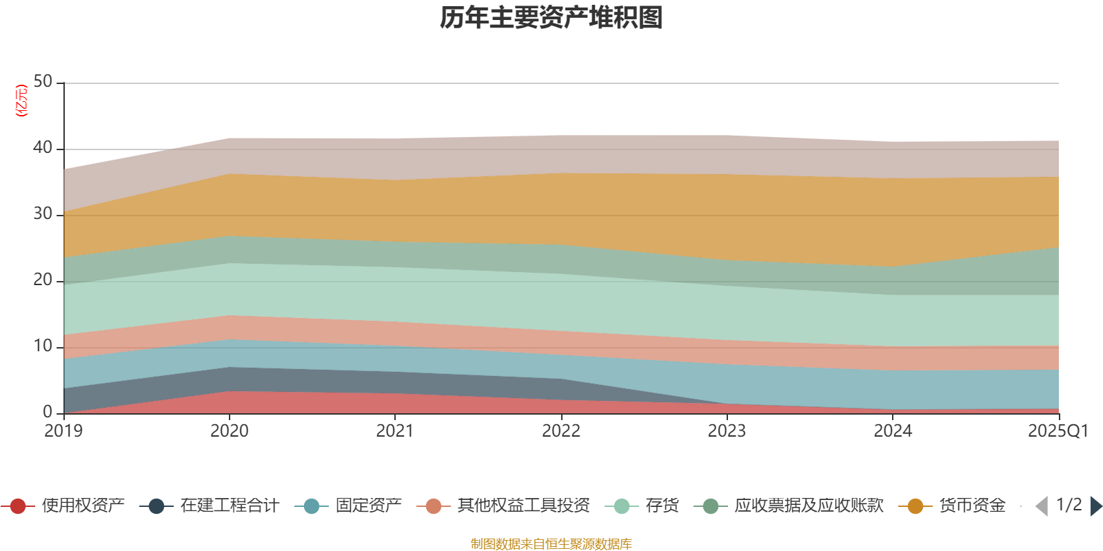 资产重大变化方面,截至2025年一季度末,公司应收票据及应收账款较上年末增加67.6%,占公司总资产比重上升7.05个百分点;货币资金较上年末减少20.22%,占公司总资产比重下降6.67个百分点;存货较上年末减少1.57%,占公司总资产比重下降0.36个百分点;使用权资产较上年末增加19.64%,占公司总资产比重上升0.26个百分点。