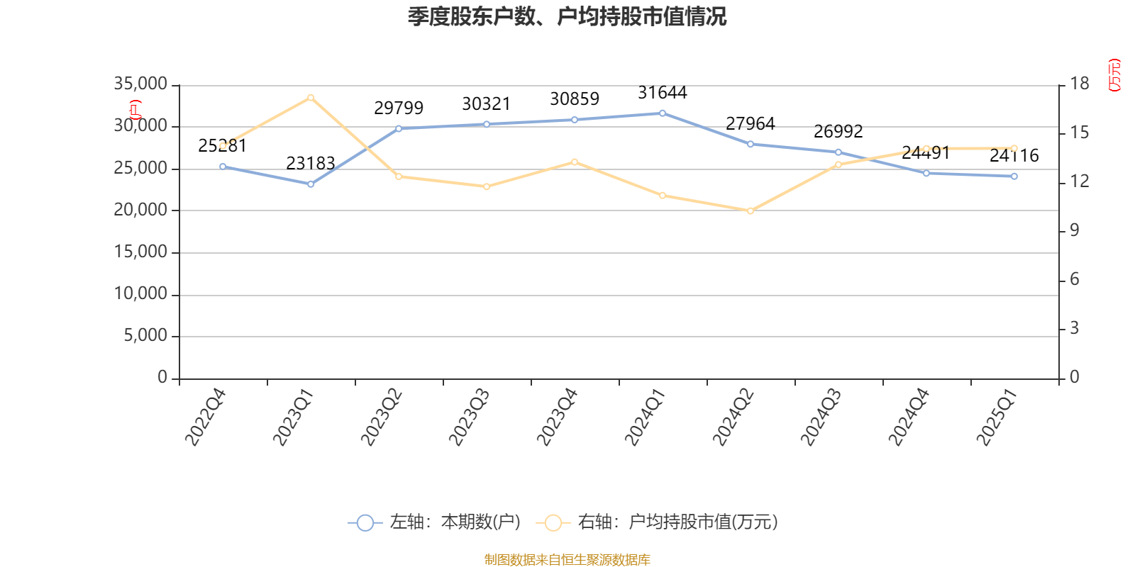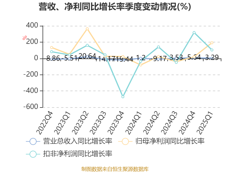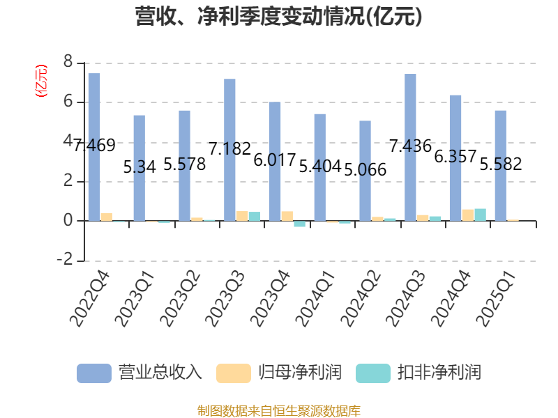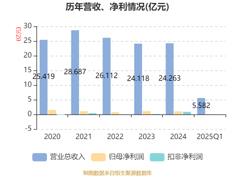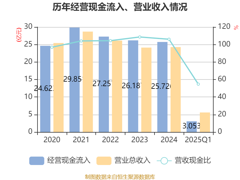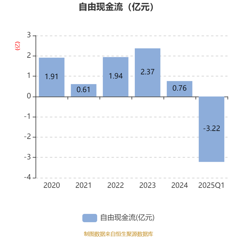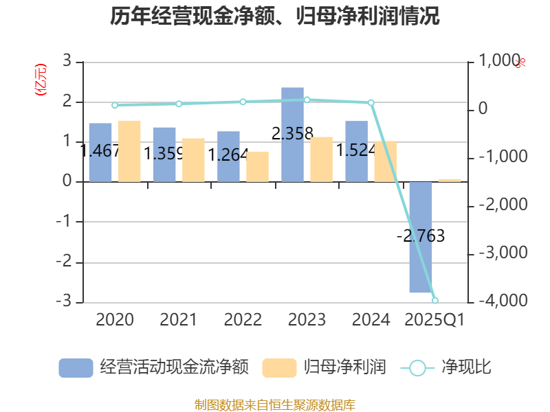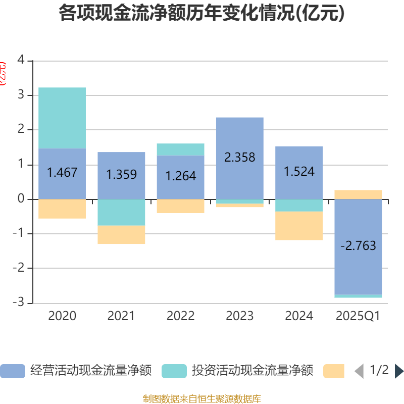 截至2025年一季度末,公司经营活动现金流净额为-2.76亿元,同比减少1013.39万元;筹资活动现金流净额2606.29万元,同比增加2482.41万元;投资活动现金流净额-841.23万元,上年同期为-329.37万元。