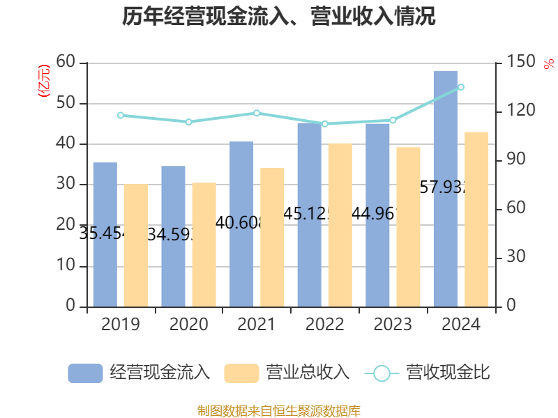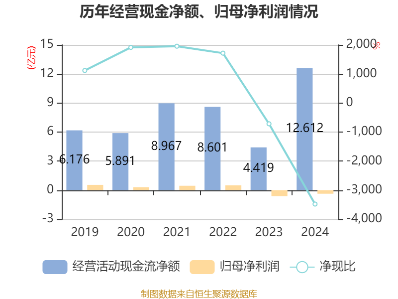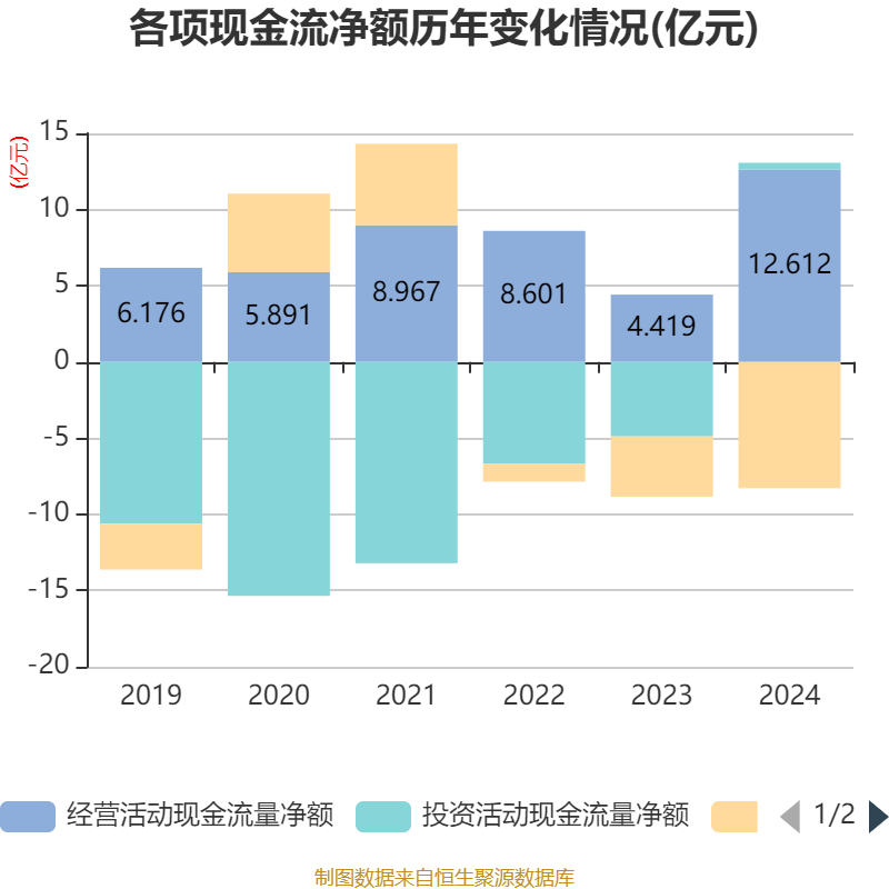 截至2024年,公司经营活动现金流净额为12.61亿元,同比增长185.41%;筹资活动现金流净额-8.28亿元,同比减少4.32亿元;投资活动现金流净额4566.59万元,上年同期为-4.88亿元。