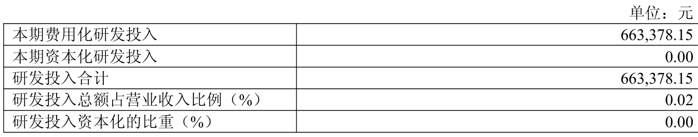 2024年全年,公司研发投入金额为66.34万元,同比下降2.39%;研发投入占营业收入比例为0.02%,相比上年同期持平。此外,公司全年研发投入资本化率为0%。