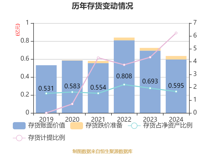 从存货变动来看,截至2024年末,公司存货账面价值为5948.65万元,占净资产的1.67%,较上年末减少985.22万元。其中,存货跌价准备为394.92万元,计提比例为6.23%。