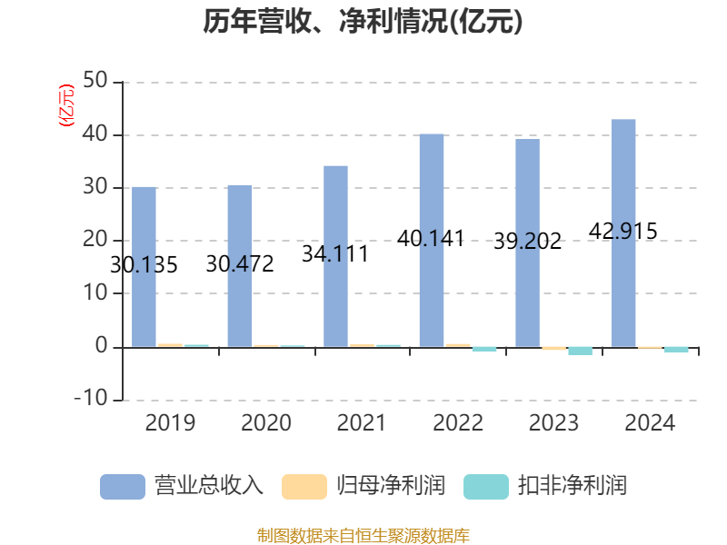 中证智能财讯郴电国际(600969)4月26日披露2024年年度报告。2024年,公司实现营业总收入42.92亿元,同比增长9.47%;归母净利润亏损3627.35万元,上年同期亏损6170.18万元;扣非净利润亏损1.1亿元,上年同期亏损1.6亿元;经营活动产生的现金流量净额为12.61亿元,同比增长185.41%;报告期内,郴电国际基本每股收益为-0.098元,加权平均净资产收益率为-1.02%。