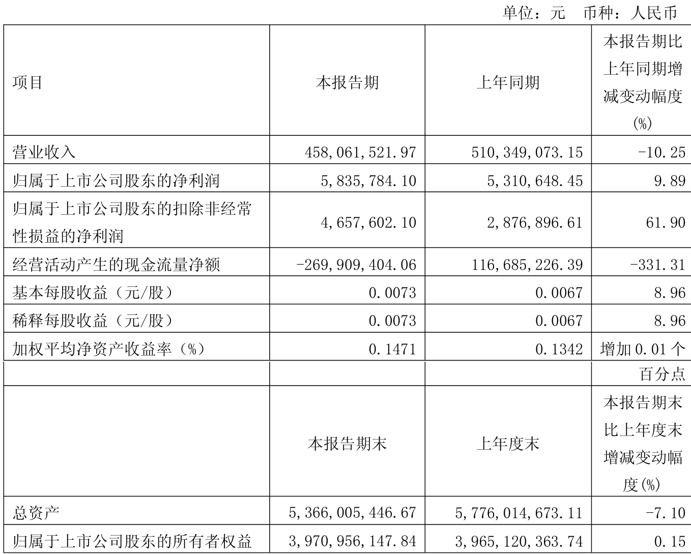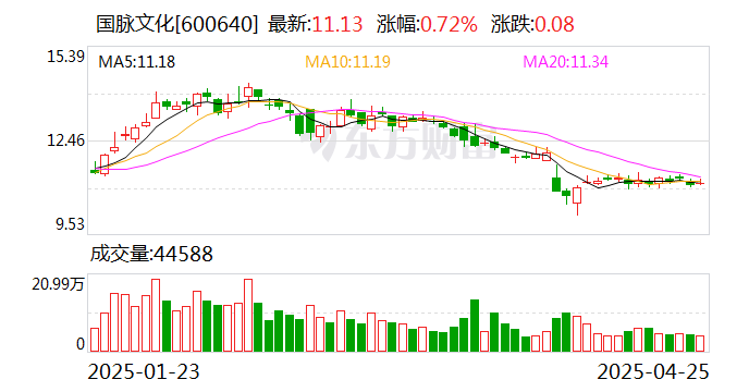 中证智能财讯国脉文化(600640)4月26日披露2025年第一季度报告。公司实现营业总收入4.58亿元,同比下降10.25%;归母净利润583.58万元,同比增长9.89%;扣非净利润465.76万元,同比增长61.90%;经营活动产生的现金流量净额为-2.7亿元,上年同期为1.17亿元;报告期内,国脉文化基本每股收益为0.0073元,加权平均净资产收益率为0.15%。
