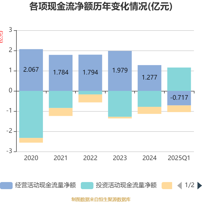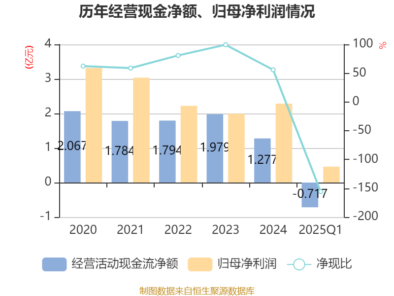 截至2025年一季度末,公司经营活动现金流净额为-7166.37万元,同比减少983.53万元;筹资活动现金流净额-3321.45万元,同比减少1.55亿元;投资活动现金流净额1.16亿元,上年同期为7662.86万元。
