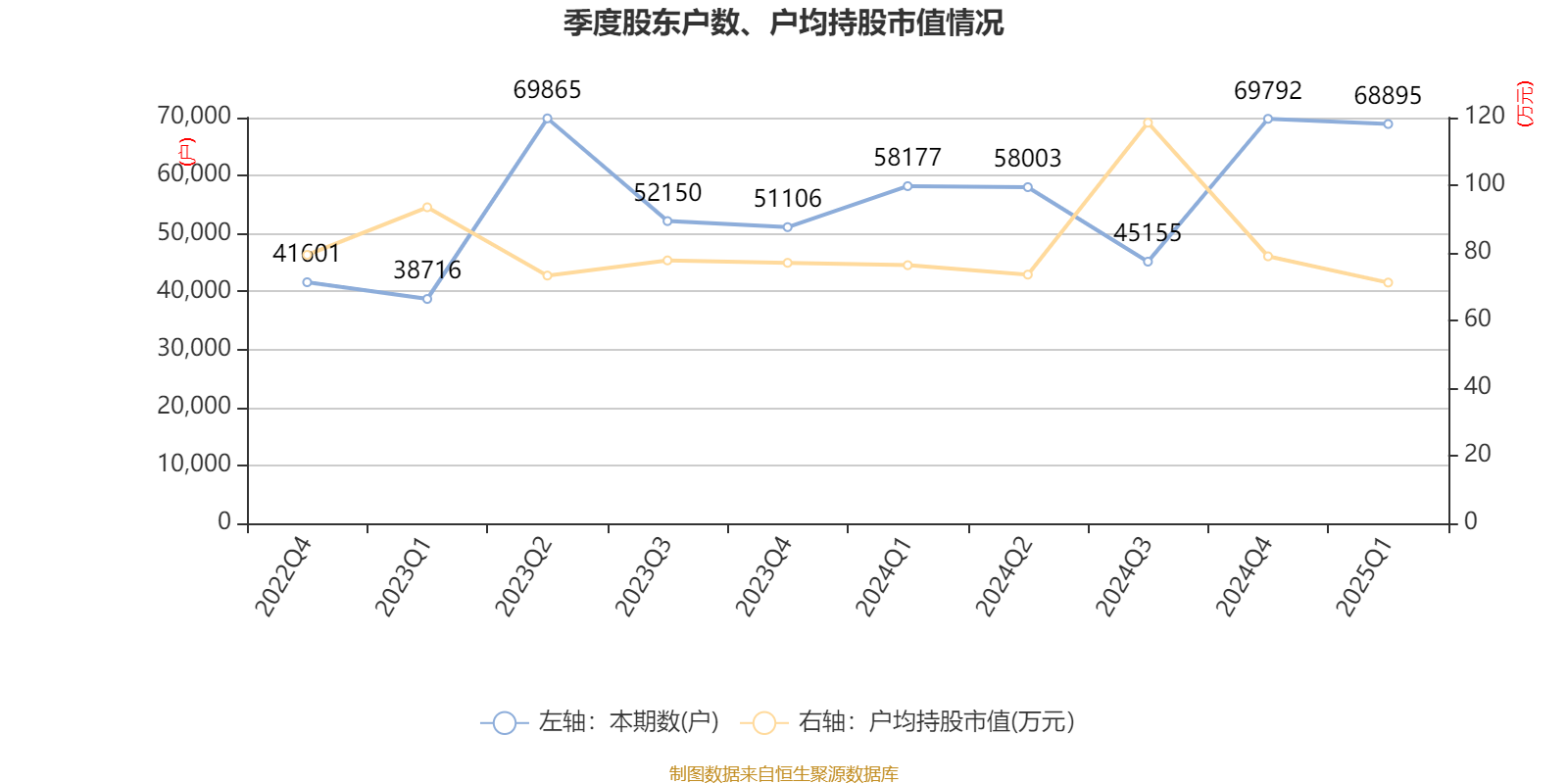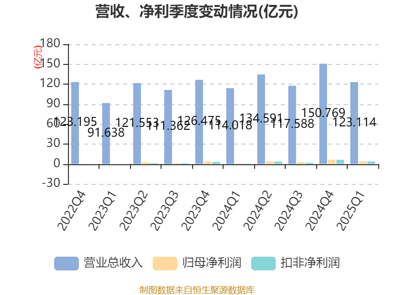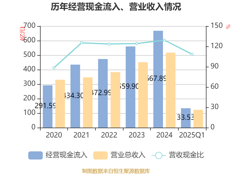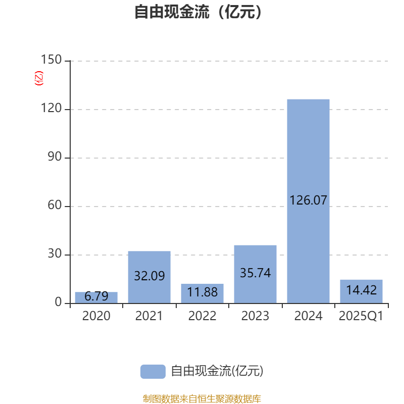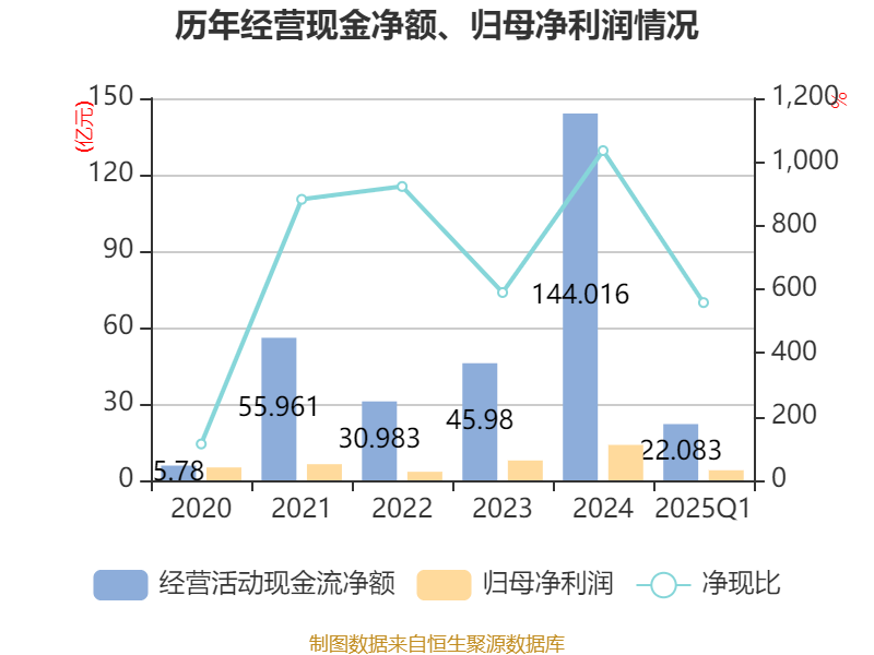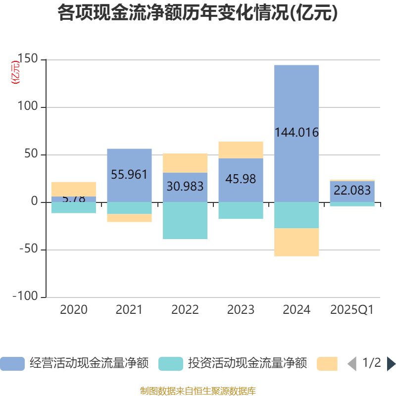 截至2025年一季度末,公司经营活动现金流净额为22.08亿元,同比增长14.8%;筹资活动现金流净额1.3亿元,同比增加2.16亿元;投资活动现金流净额-4.57亿元,上年同期为-11.99亿元。
